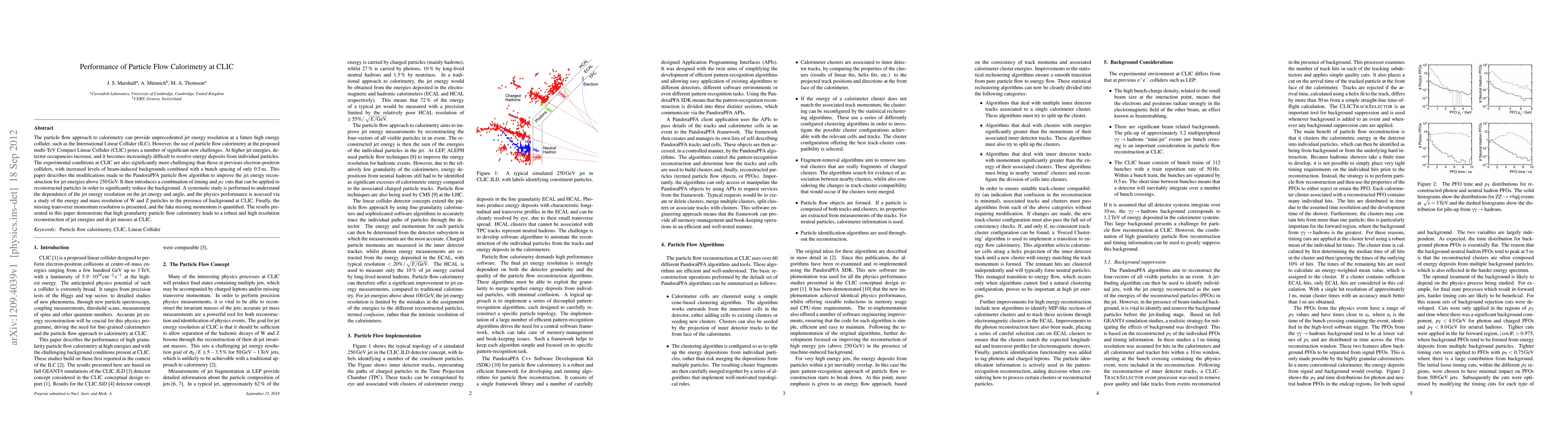 This paper investigates the performance of particle flow calorimetry at CLIC, addressing challenges due to increased detector occupancies and beam-induced backgrounds. It modifies the PandoraPFA algorithm and introduces timing and p_T cuts to improve jet energy reconstruction and reduce background, demonstrating robust high-resolution jet energy and di-jet mass reconstruction at CLIC.