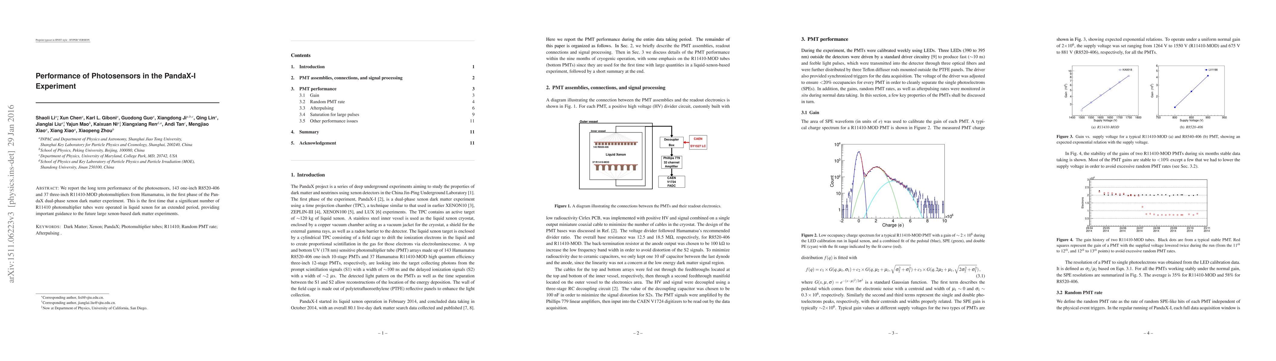 We report the long term performance of the photosensors, 143 one-inch R8520-406 and 37 three-inch R11410-MOD photomultipliers from Hamamatsu, in the first phase of the PandaX dual-phase xenon dark matter experiment. This is the first time that a significant number of R11410 photomultiplier tubes were operated in liquid xenon for an extended period, providing important guidance to the future large xenon-based dark matter experiments.