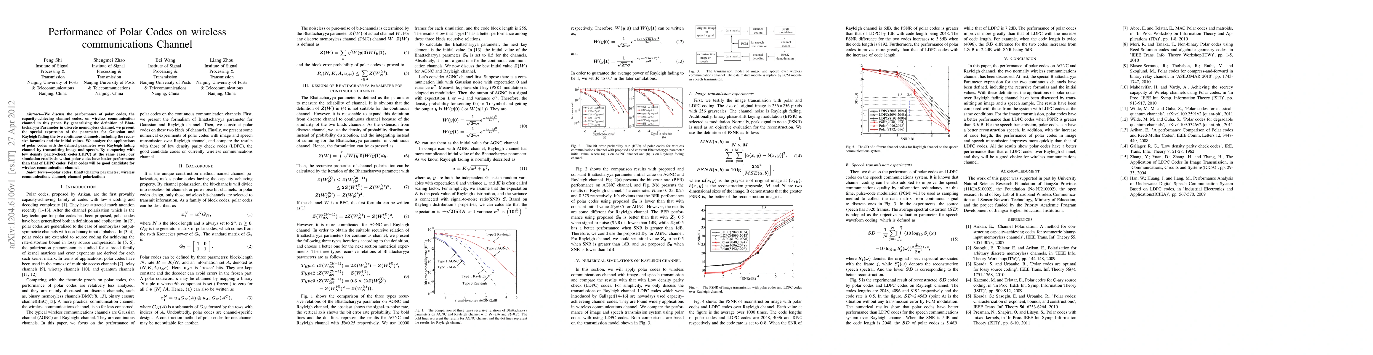 This paper evaluates the performance of polar codes on wireless communication channels, showing that they outperform low density parity-check codes (LDPC) through simulations of image and speech transmission over Rayleigh fading channels. The study generalizes the Bhattacharyya Parameter for Gaussian and Rayleigh fading channels, providing recursive formulas and initial values.