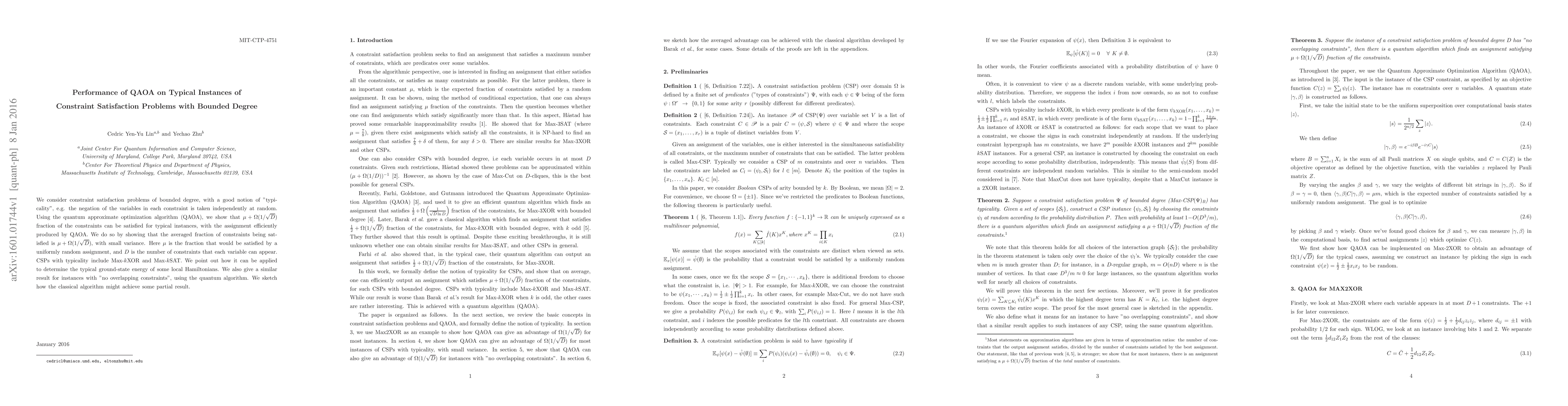The research demonstrates that the Quantum Approximate Optimization Algorithm (QAOA) can satisfy a significant fraction (u03bc + Ω(1/√D)) of constraints in typical instances of bounded-degree Constraint Satisfaction Problems (CSPs), such as Max-kXOR and Max-kSAT, outperforming random assignment. This is achieved with low variance in constraint satisfaction, and the method extends to instances with no overlapping constraints. The findings suggest QAOA's potential for determining typical ground-state energies of certain local Hamiltonians and hint at possible classical algorithmic approaches.