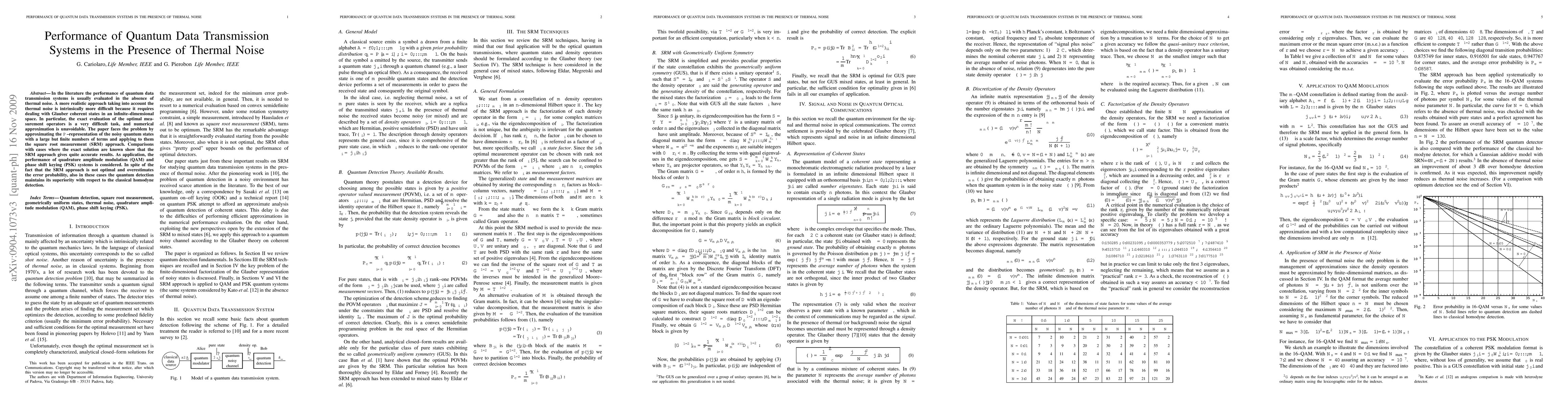 In the literature the performance of quantum data transmission systems is usually evaluated in the absence of thermal noise. A more realistic approach taking into account the thermal noise is intrinsically more difficult because it requires dealing with Glauber coherent states in an infinite--dimensional space. In particular, the exact evaluation of the optimal measurement operators is a very difficult task, and numerical approximation is unavoidable. The paper faces the problem by approximating the P-representation of the noisy quantum states with a large but finite number of terms and applying to them the square root measurement (SRM) approach. Comparisons with the exact solution obtained with convex semidefinite programming show that the SRM approach gives quite accurate results. As application, the performance of quadrature amplitude modulation (QAM) and phase shift keying (PSK) systems is considered. In spite of the fact that the SRM approach is not optimal and overestimates the error probability, also in these cases the quantum detection maintains its superiority with respect to the classical homodyne detection.