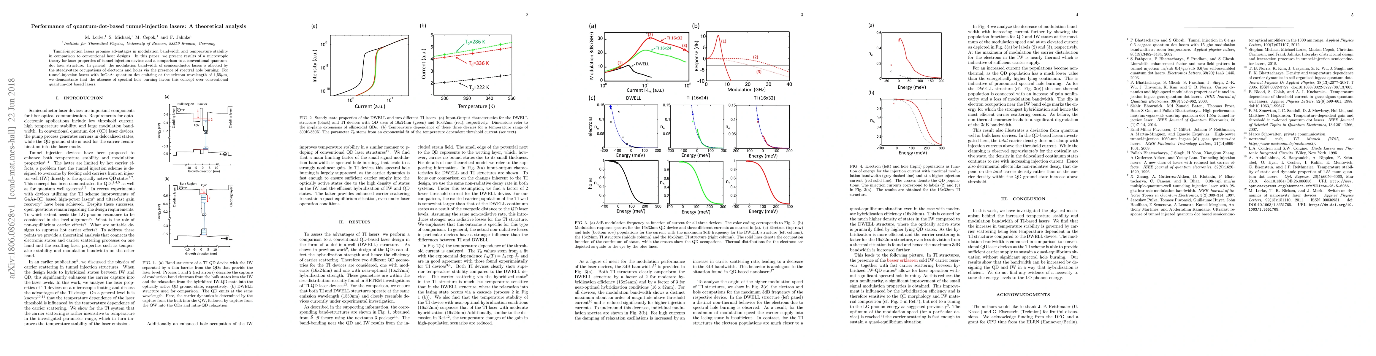 This paper theoretically analyzes the performance of quantum-dot-based tunnel-injection lasers, showing they outperform conventional quantum-dot lasers in modulation bandwidth and temperature stability due to the absence of spectral hole burning. The study compares these lasers to traditional quantum-dot structures.