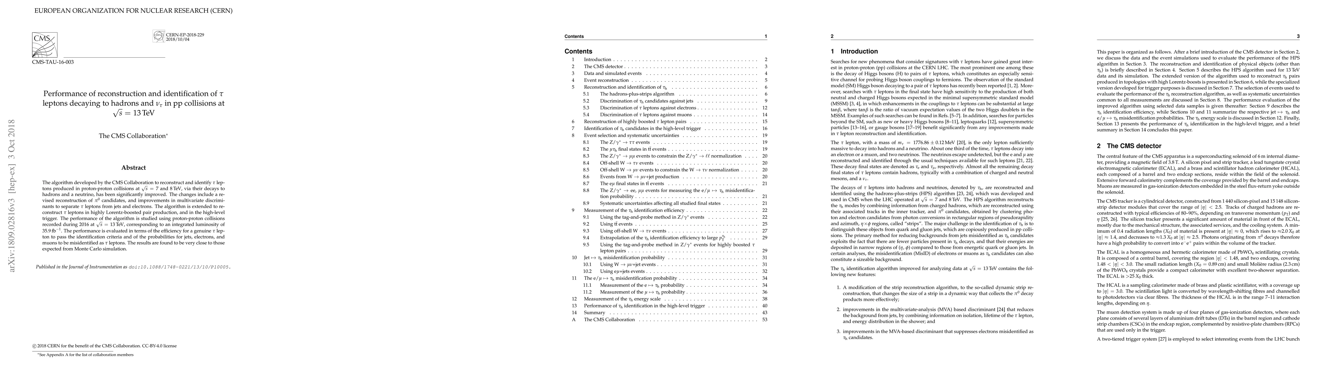 The CMS Collaboration improved an algorithm for reconstructing and identifying $\tau$ leptons decaying to hadrons and neutrinos, extending its application to 13 TeV proton-proton collisions. The performance is nearly identical to Monte Carlo simulations, demonstrating high efficiency for genuine $\tau$ identification and low misidentification rates for jets, electrons, and muons.