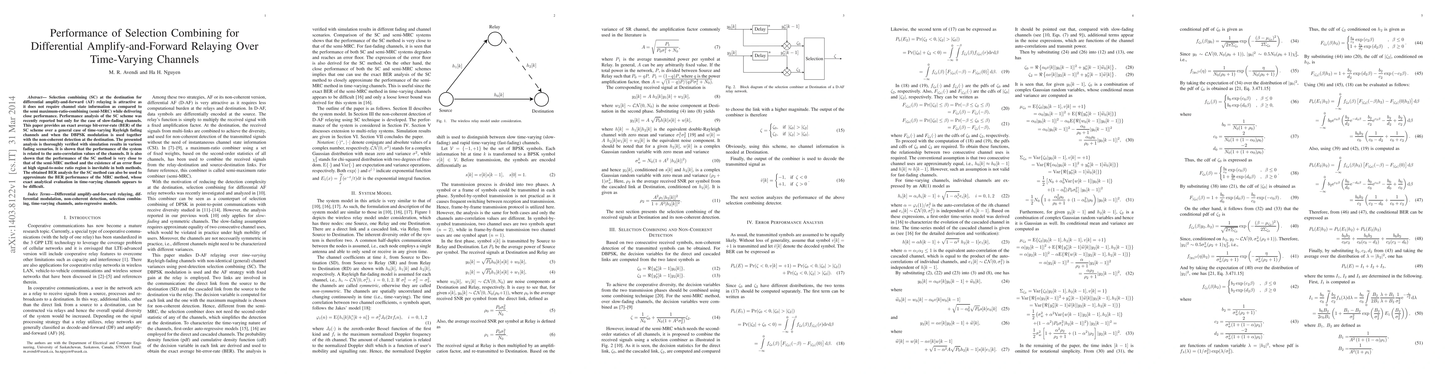 Selection combining (SC) at the destination for differential amplify-and-forward (AF) relaying is attractive as it does not require channel state information as compared to the semi maximum-ratio-combining (semi-MRC) while delivering close performance. Performance analysis of the SC scheme was recently reported but only for the case of slow-fading channels. This paper provides an exact average bit-error-rate (BER) of the SC scheme over a general case of time-varying Rayleigh fading channels and when the DBPSK modulation is used together with the non-coherent detection at the destination. The presented analysis is thoroughly verified with simulation results in various fading scenarios. It is shown that the performance of the system is related to the auto-correlation values of the channels. It is also shown that the performance of the SC method is very close to that of the semi-MRC method and the existence of an error floor at high signal-to-noise ratio region is inevitable in both methods. The obtained BER analysis for the SC method can also be used to approximate the BER performance of the MRC method, whose exact analytical evaluation in time-varying channels appears to be difficult.