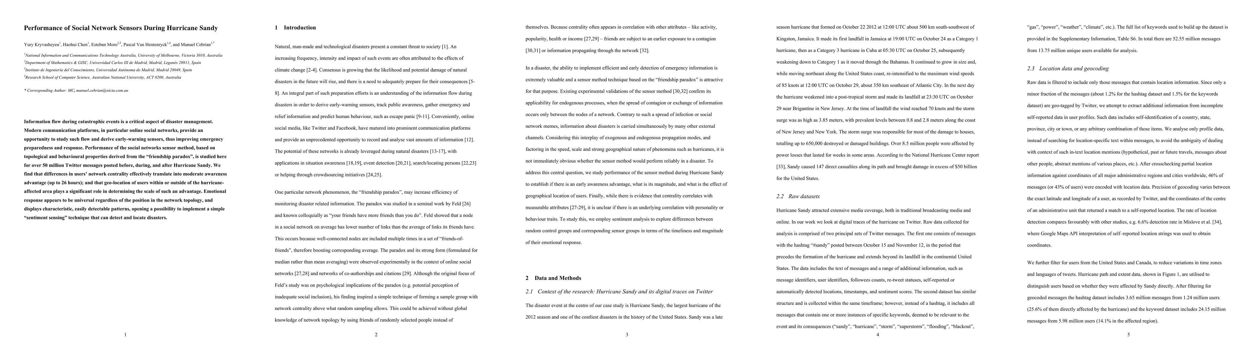 Information flow during catastrophic events is a critical aspect of disaster management. Modern communication platforms, in particular online social networks, provide an opportunity to study such flow, and a mean to derive early-warning sensors, improving emergency preparedness and response. Performance of the social networks sensor method, based on topological and behavioural properties derived from the "friendship paradox", is studied here for over 50 million Twitter messages posted before, during, and after Hurricane Sandy. We find that differences in user's network centrality effectively translate into moderate awareness advantage (up to 26 hours); and that geo-location of users within or outside of the hurricane-affected area plays significant role in determining the scale of such advantage. Emotional response appears to be universal regardless of the position in the network topology, and displays characteristic, easily detectable patterns, opening a possibility of implementing a simple "sentiment sensing" technique to detect and locate disasters.