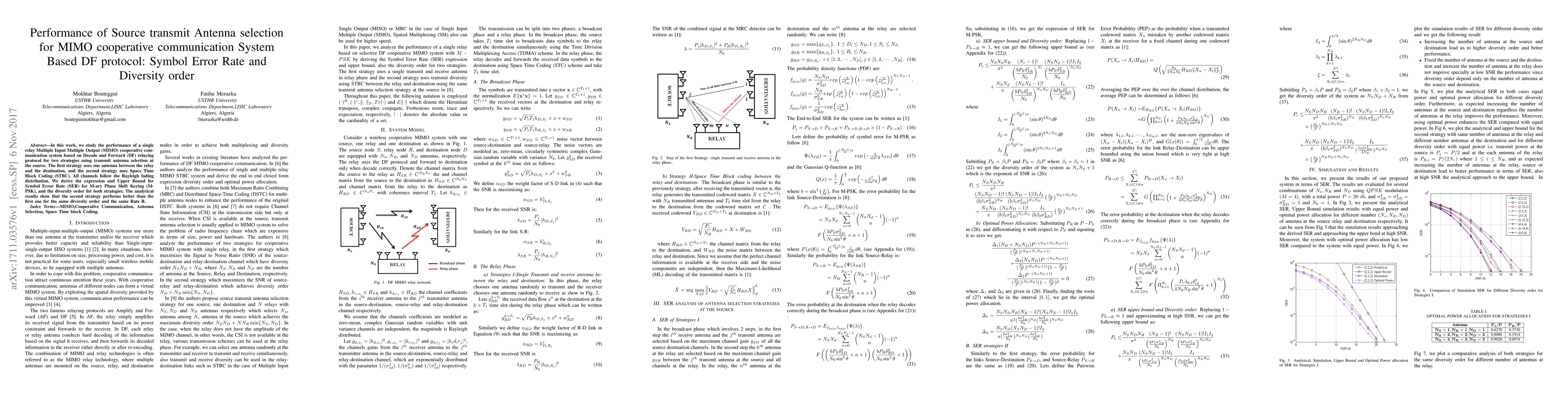 In this work, we study the performance of a single relay Multiple Input Multiple Output (MIMO) cooperative communication system based on Decode and Forward (DF) relaying protocol for two strategies using transmit antenna selection at the source. The first strategy uses one antenna between the relay and the destination, and the second strategy uses Space Time Block Coding (STBC). All channels follow the Rayleigh fading distribution. We derive the expression and Upper Bound for Symbol Error Rate (SER) for M-ary Phase Shift Keying (M-PSK), and the diversity order for both strategies. The analytical results show that the second strategy performs better than the first one for the same diversity order and the same Rate R.