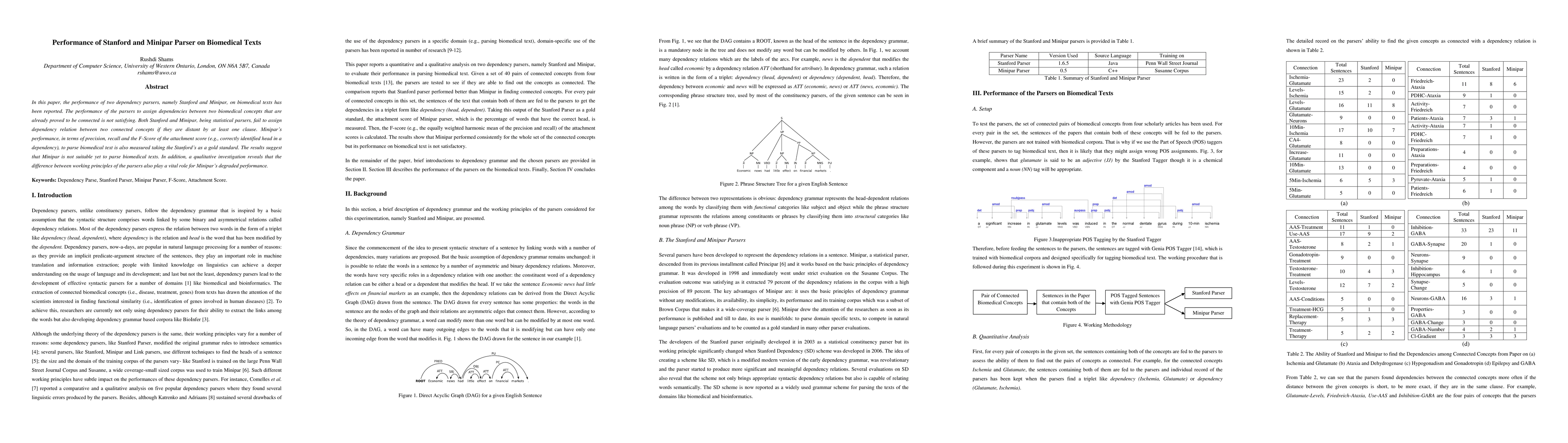 This paper evaluates the performance of Stanford and Minipar parsers on biomedical texts, finding both struggle to assign dependencies between distant concepts. Minipar's precision, recall, and F-score fall short compared to Stanford, indicating it is not yet suitable for parsing biomedical texts, partly due to differences in their working principles.