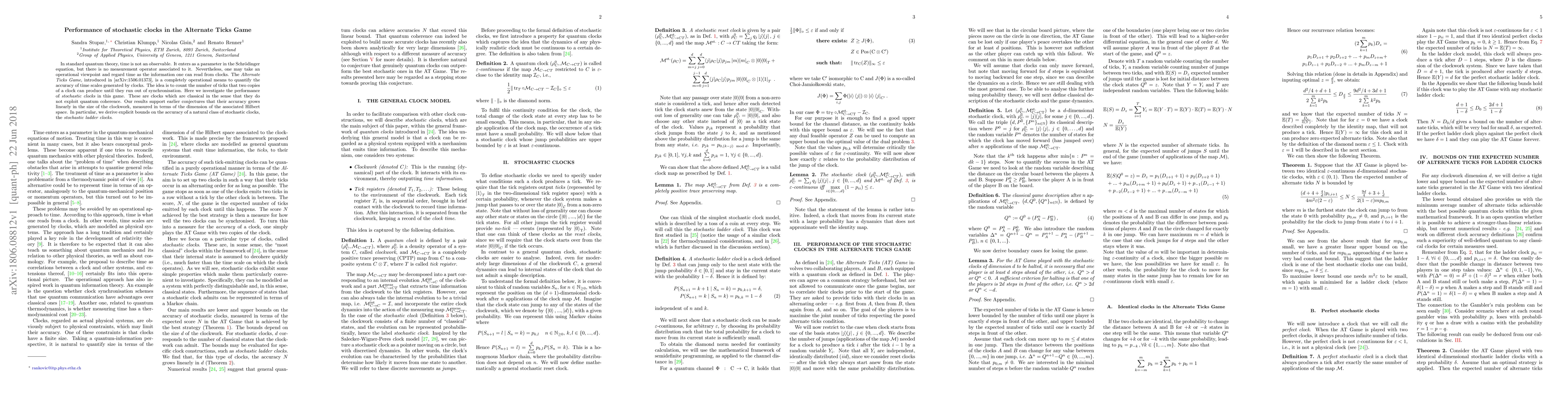 In standard quantum theory, time is not an observable. It enters as a parameter in the Schr\"odinger equation, but there is no measurement operator associated to it. Nevertheless, one may take an operational viewpoint and regard time as the information one can read from clocks. The Alternate Ticks Game, introduced in arXiv:1506.01373, is a completely operational means to quantify the accuracy of time scales generated by clocks. The idea is to count the number of ticks that two copies of a clock can produce until they run out of synchronisation. Here we investigate the performance of stochastic clocks in this game. These are clocks which are classical in the sense that they do not exploit quantum coherence. Our results support earlier conjectures that their accuracy grows linearly in the size of the clockwork, measured in terms of the dimension of the associated Hilbert space. In particular, we derive explicit bounds on the accuracy of a natural class of stochastic clocks, the stochastic ladder clocks.
