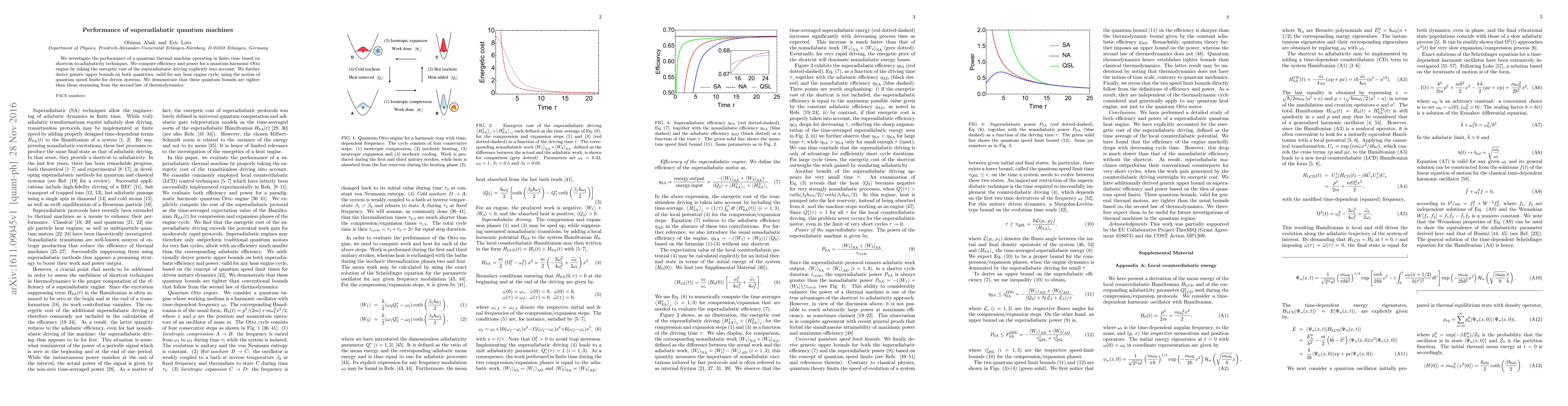 We investigate the performance of a quantum thermal machine operating in finite time based on shortcut-to-adiabaticity techniques. We compute efficiency and power for a quantum harmonic Otto engine by taking the energetic cost of the superadiabatic driving explicitly into account. We further derive generic upper bounds on both quantities, valid for any heat engine cycle, using the notion of quantum speed limits for driven systems. We demonstrate that these quantum bounds are tighter than those stemming from the second law of thermodynamics.