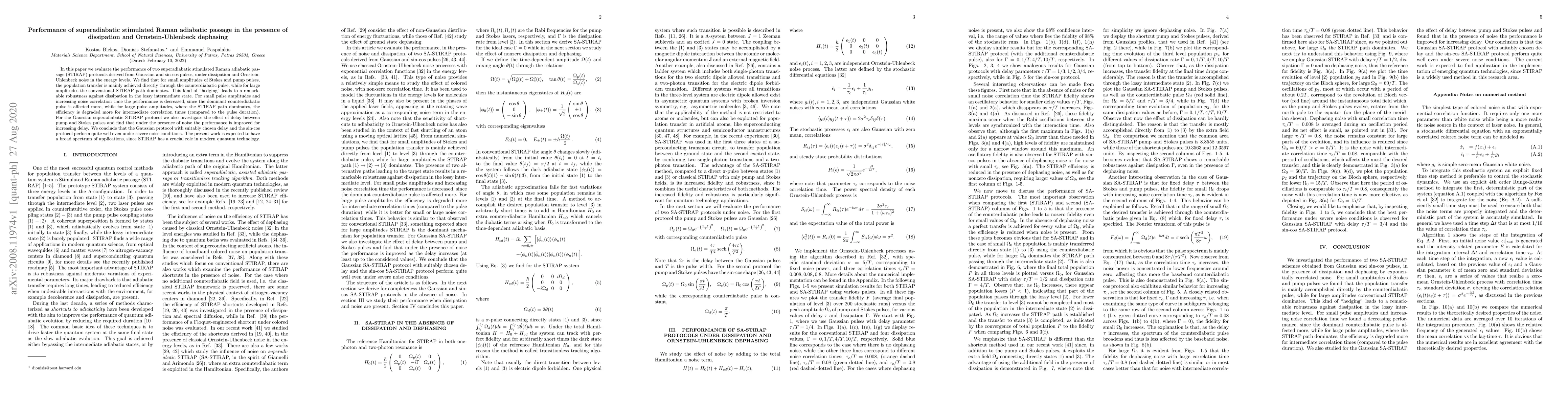 This study investigates the performance of superadiabatic stimulated Raman adiabatic passage under dissipation and noise, finding that certain protocols remain robust against losses in intermediate states.