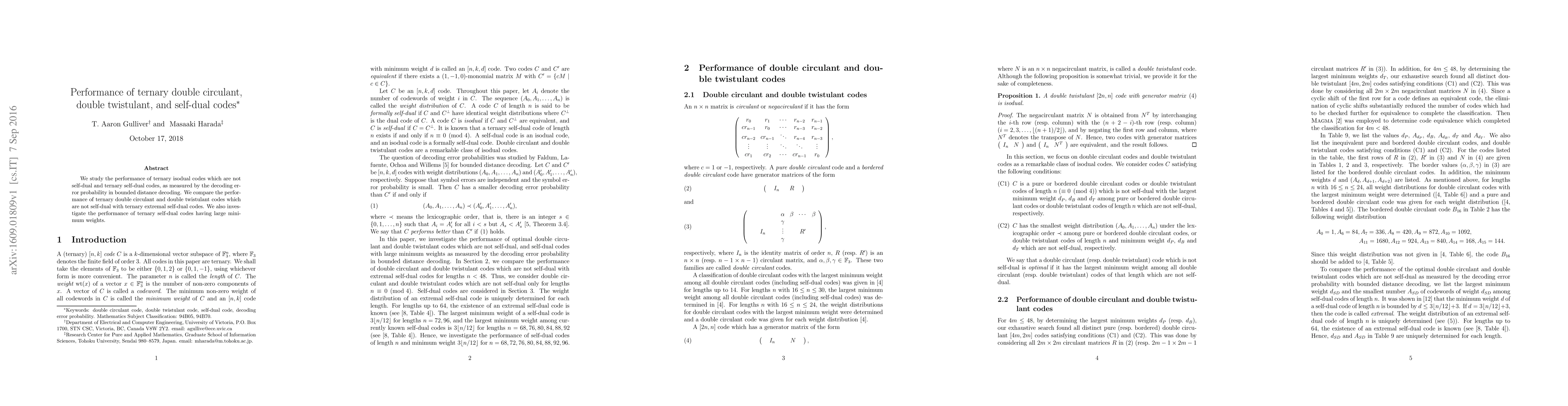 This paper evaluates the decoding error probabilities of ternary double circulant, double twistulant, and self-dual codes, comparing their performance in bounded distance decoding against ternary extremal self-dual codes. It also examines the performance of ternary self-dual codes with large minimum weights.