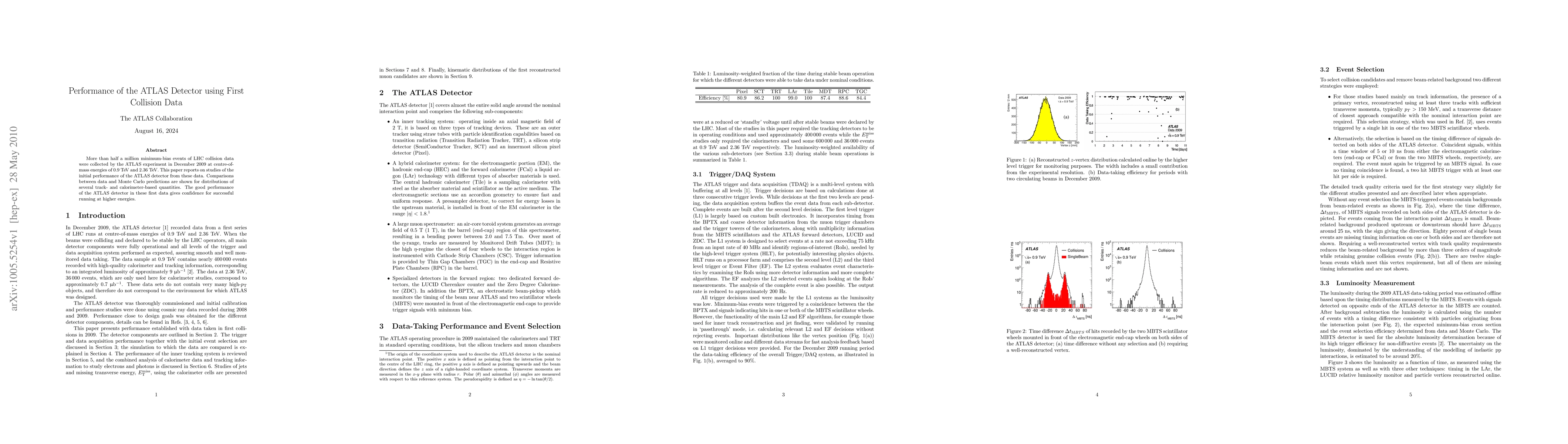 This paper evaluates the initial performance of the ATLAS detector using first collision data from the LHC, showing favorable comparisons between observed events and Monte Carlo predictions, thus confirming the detector's capability for future high-energy operations.
