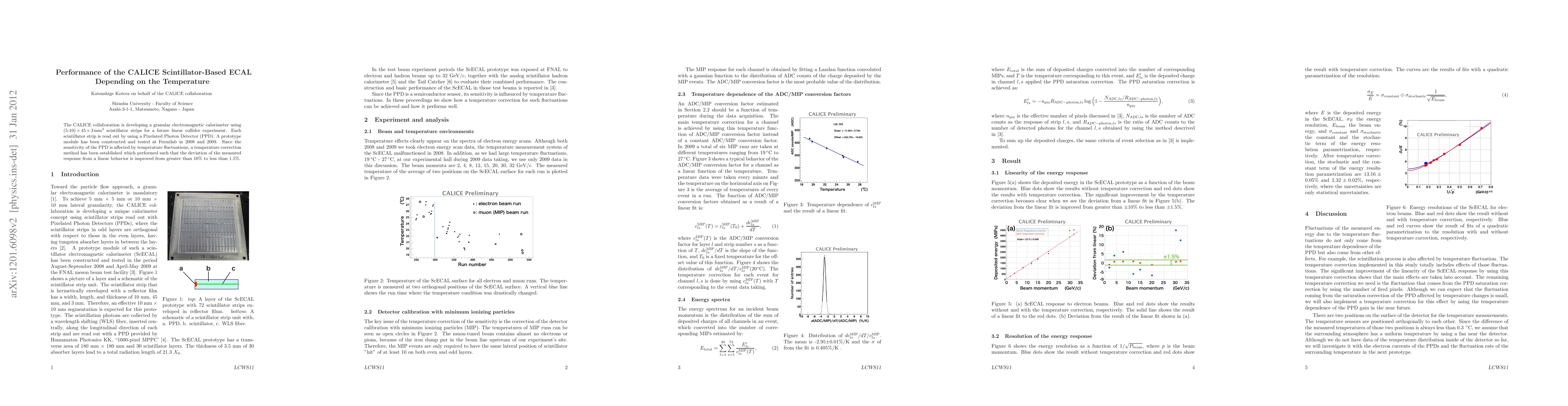 The CALICE collaboration developed a granular electromagnetic calorimeter using scintillator strips, which were tested at Fermilab. A temperature correction method was established to improve the response accuracy of the Pixelated Photon Detector, reducing deviation from linear behavior from over 10% to less than 1.5%.