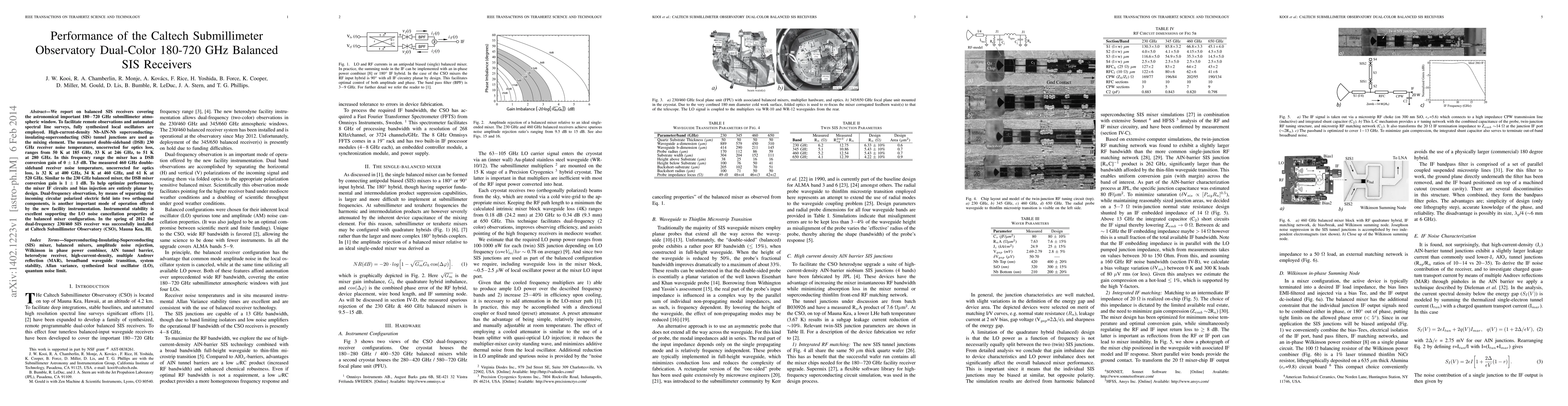 This paper presents the performance of balanced SIS receivers operating in the 180-720 GHz submillimeter range, featuring high-current-density Nb-AlN-Nb junctions and synthesized local oscillators for remote and automated spectral line observations. The receivers exhibit low noise temperatures and stable conversion gains, with successful installation at the Caltech Submillimeter Observatory in 2012.