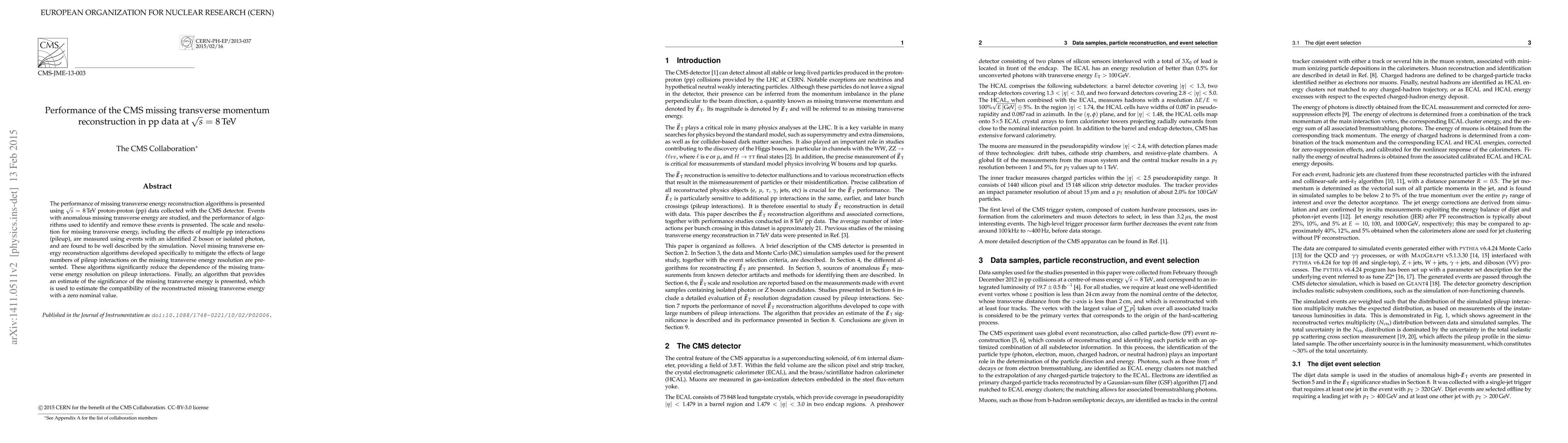 Researchers evaluated the performance of a missing transverse energy reconstruction algorithm using CMS pp data at 8 TeV, introducing new algorithms to reduce pileup's impact on resolution.
