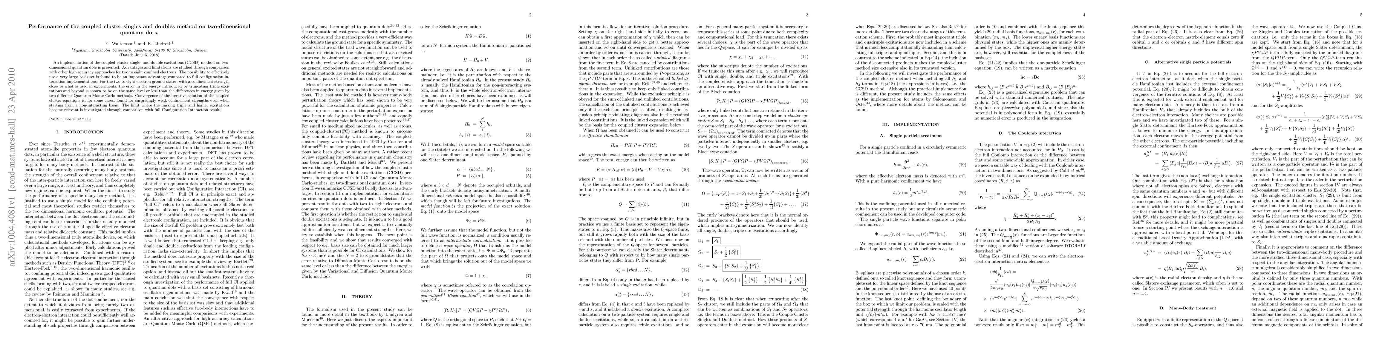 An implementation of the coupled-cluster single- and double excitations (CCSD) method on two-dimensional quantum dots is presented. Advantages and limitations are studied through comparison with other high accuracy approaches for two to eight confined electrons. The possibility to effectively use a very large basis set is found to be an important advantage compared to full configuration interaction implementations. For the two to eight electron ground states, with a confinement strength close to what is used in experiments, the error in the energy introduced by truncating triple excitations and beyond is shown to be on the same level or less than the differences in energy given by two different Quantum Monte Carlo methods. Convergence of the iterative solution of the coupled cluster equations is, for some cases, found for surprisingly weak confinement strengths even when starting from a non-interacting basis. The limit where the missing triple and higher excitations become relevant is investigated through comparison with full Configuration Interaction results.