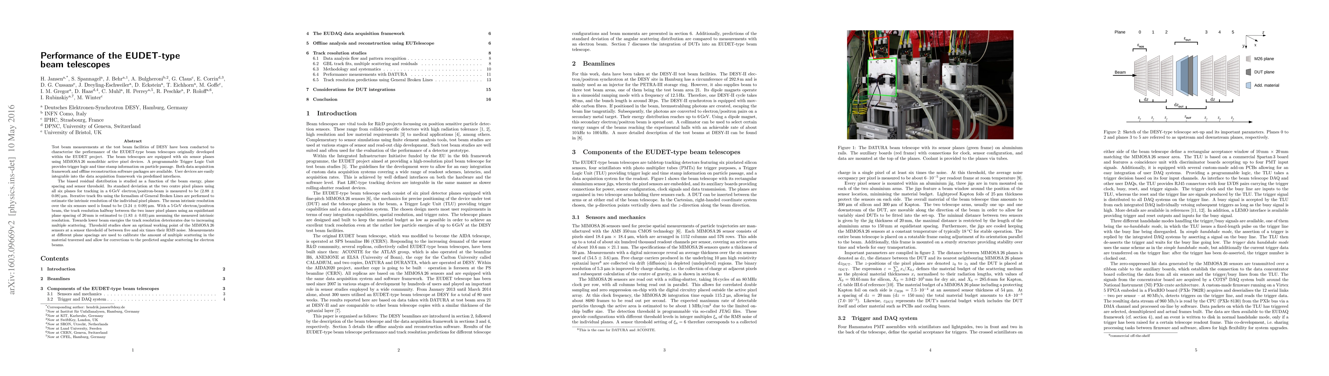 Test beam measurements at the test beam facilities of DESY have been conducted to characterise the performance of the EUDET-type beam telescopes originally developed within the EUDET project. The beam telescopes are equipped with six sensor planes using MIMOSA26 monolithic active pixel devices. A programmable Trigger Logic Unit provides trigger logic and time stamp information on particle passage. Both data acquisition framework and offline reconstruction software packages are available. User devices are easily integrable into the data acquisition framework via predefined interfaces. The biased residual distribution is studied as a function of the beam energy, plane spacing and sensor threshold. Its standard deviation at the two centre pixel planes using all six planes for tracking in a 6\,GeV electron/positron-beam is measured to be $(2.88\,\pm\,0.08)\,\upmu\meter$.Iterative track fits using the formalism of General Broken Lines are performed to estimate the intrinsic resolution of the individual pixel planes. The mean intrinsic resolution over the six sensors used is found to be $(3.24\,\pm\,0.09)\,\upmu\meter$.With a 5\,GeV electron/positron beam, the track resolution halfway between the two inner pixel planes using an equidistant plane spacing of 20\,mm is estimated to $(1.83\,\pm\,0.03)\,\upmu\meter$ assuming the measured intrinsic resolution. Towards lower beam energies the track resolution deteriorates due to increasing multiple scattering. Threshold studies show an optimal working point of the MIMOSA26 sensors at a sensor threshold of between five and six times their RMS noise. Measurements at different plane spacings are used to calibrate the amount of multiple scattering in the material traversed and allow for corrections to the predicted angular scattering for electron beams.