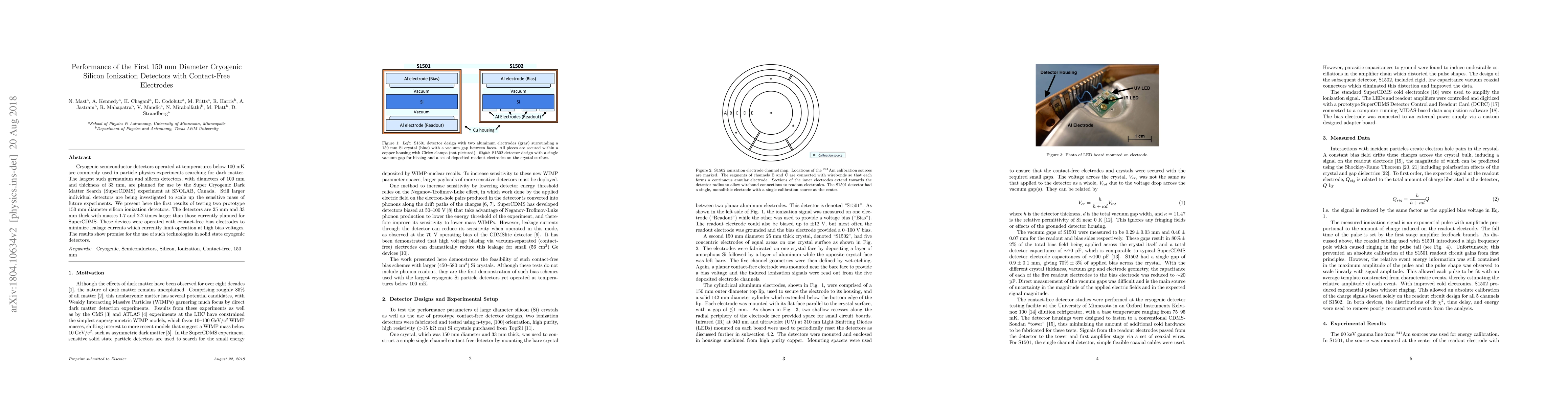Cryogenic semiconductor detectors operated at temperatures below 100 mK are commonly used in particle physics experiments searching for dark matter. The largest such germanium and silicon detectors, with diameters of 100 mm and thickness of 33 mm, are planned for use by the Super Cryogenic Dark Matter Search (SuperCDMS) experiment at SNOLAB, Canada. In order to scale up the sensitive mass of future experiments, larger individual detectors are being investigated. We present here the first results of testing two prototype 150 mm diameter silicon ionization detectors. The detectors are 25 mm and 33 mm thick with masses 1.7 and 2.2 times larger than those currently planned for SuperCDMS. These devices were operated with contact-free bias electrodes to minimize leakage currents which currently limit operation at high bias voltages. One detector was instrumented to read out ionization signals using a single contact-free readout electrode and the other with an array of electrodes patterned on the crystal surface. The results show promise for the use of both large volume silicon detectors and contact-free electrode arrangements for scaling up solid state cryogenic detector mass and bias voltage.