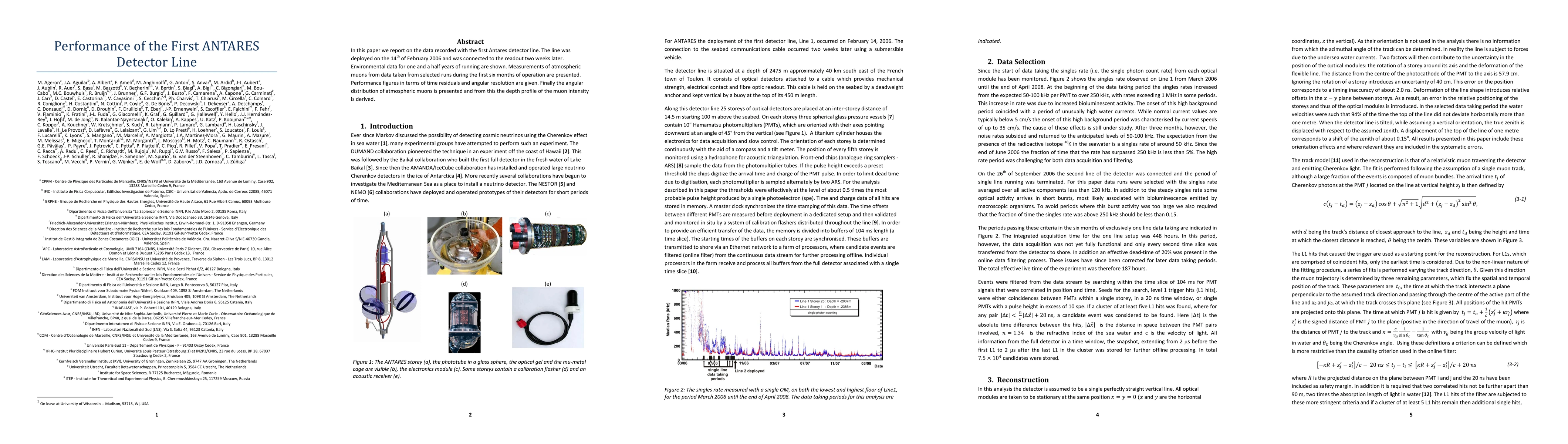 This paper reports on the first six months of operation for the initial Antares detector line deployed in February 2006, detailing performance metrics such as time residuals and angular resolution, and presenting the angular distribution and depth profile of atmospheric muons.