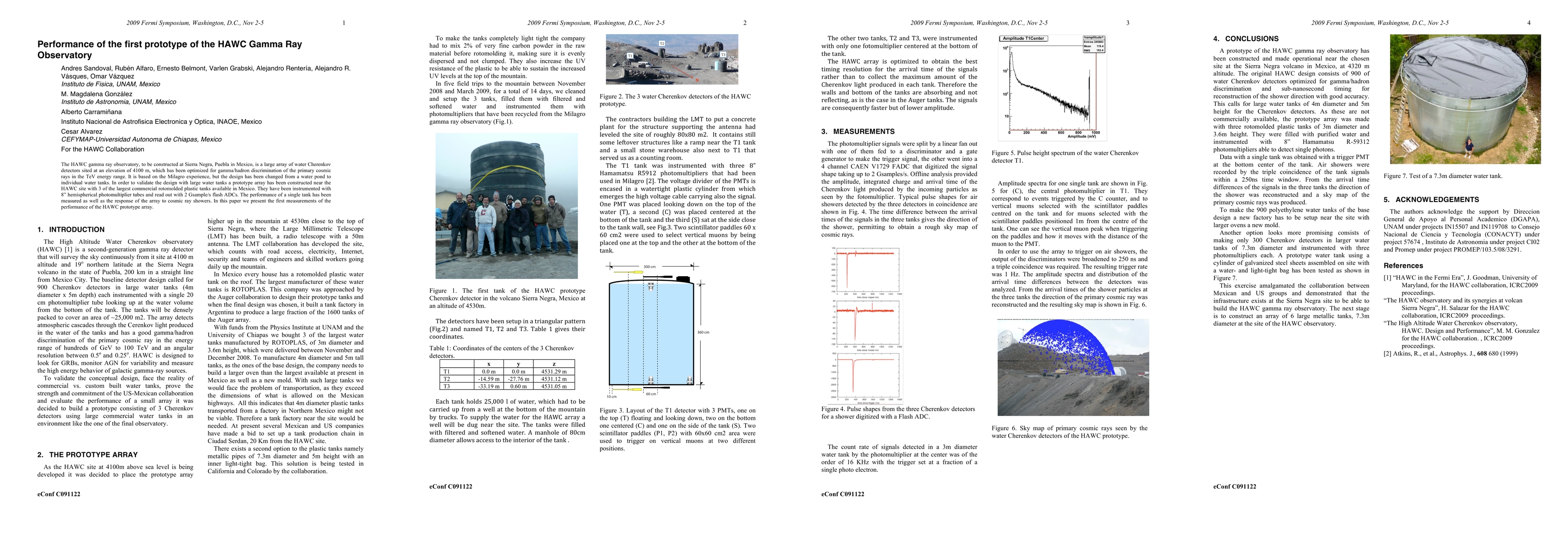 The HAWC gamma ray observatory, to be constructed at Sierra Negra, Puebla in Mexico, is a large array of water Cherenkov detectors sited at an elevation of 4100 m, which has been optimized for gamma/hadron discrimination of the primary cosmic rays in the TeV energy range. It is based on the Milagro experience, but the design has been changed from a water pond to individual water tanks. In order to validate the design with large water tanks a prototype array has been constructed near the HAWC site with 3 of the largest commercial rotomolded plastic tanks available in Mexico. They have been instrumented with 20 cm hemispherical photomultiplier tubes and read out with 2 Gsample/s flash ADCs. The performance of a single tank has been measured as well as the response of the array to cosmic ray showers. In this paper we present the first measurements of the performance of the HAWC prototype array.