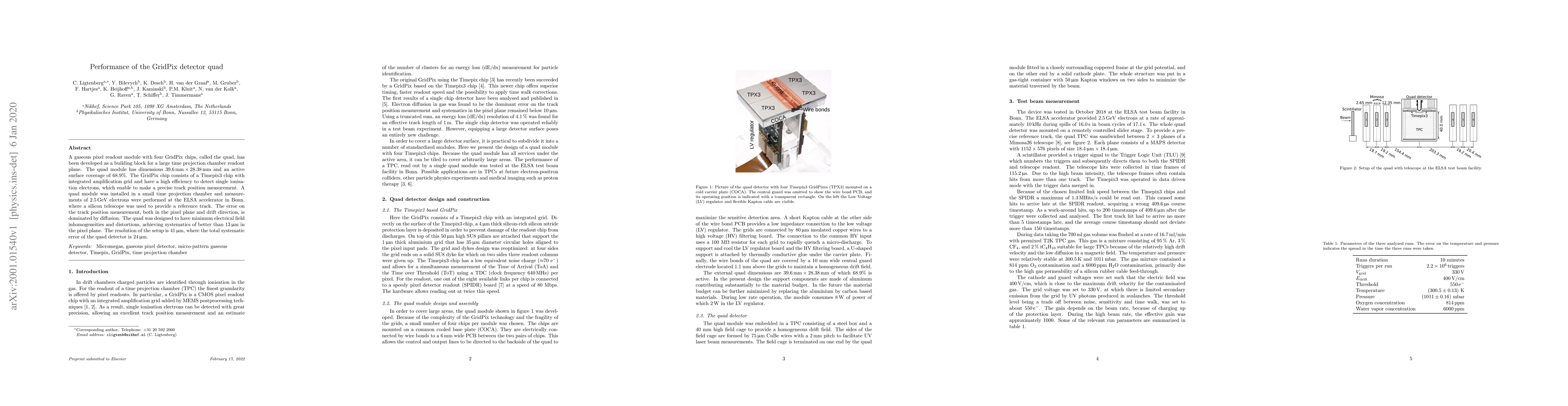 The GridPix detector quad, composed of four GridPix chips, demonstrates high efficiency in detecting single ionization electrons and precise track position measurements. The quad module achieved a resolution of 41 µm, with a total systematic error of 24 µm, primarily dominated by diffusion.