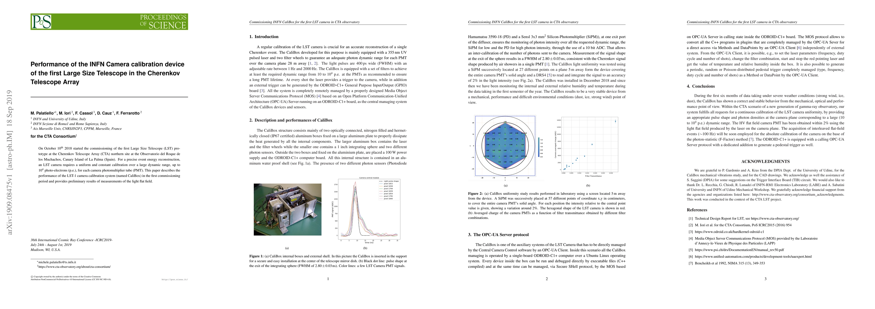 This paper evaluates the performance of the INFN CaliBox calibration device for the first Large Size Telescope (LST-1) prototype in the Cherenkov Telescope Array (CTA) during its initial commissioning phase. Preliminary results indicate successful calibration over a dynamic range of up to $10^{4}$ photo-electrons, essential for precise energy reconstruction.
