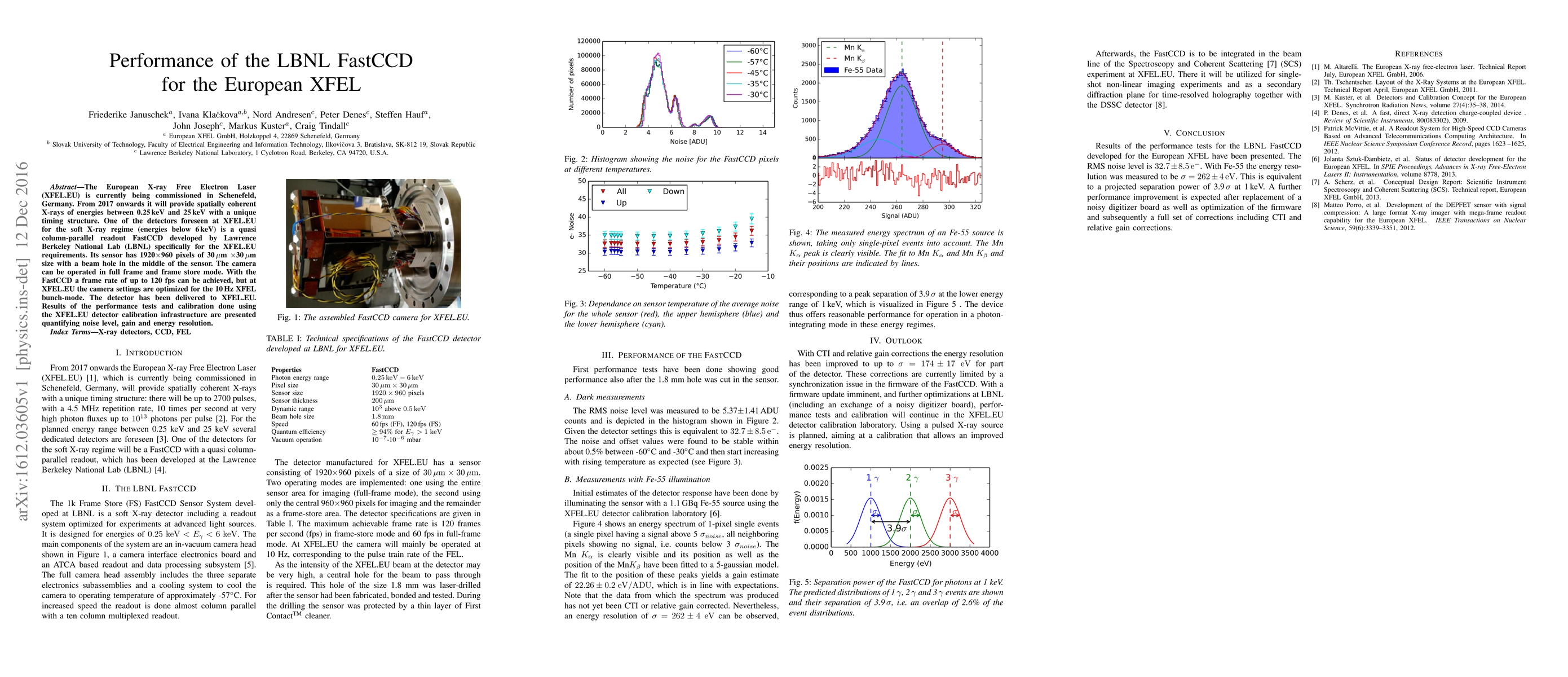 The European X-ray Free Electron Laser (XFEL.EU) is currently being commissioned in Schenefeld, Germany. From 2017 onwards it will provide spatially coherent X-rays of energies between 0.25\,keV and 25\,keV with a unique timing structure. One of the detectors foreseen at XFEL.EU for the soft X-ray regime (energies below 6\,keV) is a quasi column-parallel readout FastCCD developed by Lawrence Berkeley National Lab (LBNL) specifically for the XFEL.EU requirements. Its sensor has 1920$\times$960 pixels of 30\,$\mu$m $\times$30\,$\mu$m size with a beam hole in the middle of the sensor. The camera can be operated in full frame and frame store mode. With the FastCCD a frame rate of up to 120~fps can be achieved, but at XFEL.EU the camera settings are optimized for the 10\,Hz XFEL bunch-mode. The detector has been delivered to XFEL.EU. Results of the performance tests and calibration done using the XFEL.EU detector calibration infrastructure are presented quantifying noise level, gain and energy resolution.