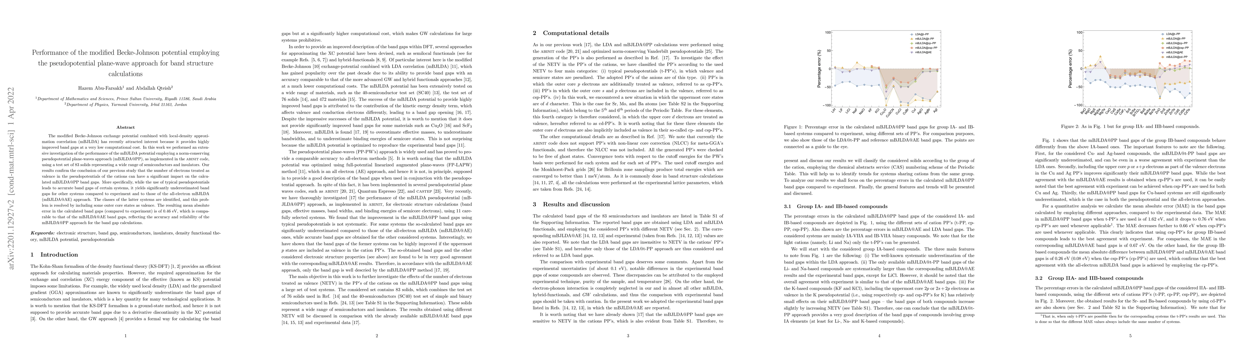 This paper investigates the performance of the modified Becke-Johnson potential (mBJLDA) in pseudopotential plane-wave calculations using the abinit code. The study finds that treating additional outer core states as valence improves the accuracy of band gap calculations, reducing the mean absolute error to 0.46 eV, comparable to the all-electron mBJLDA method.