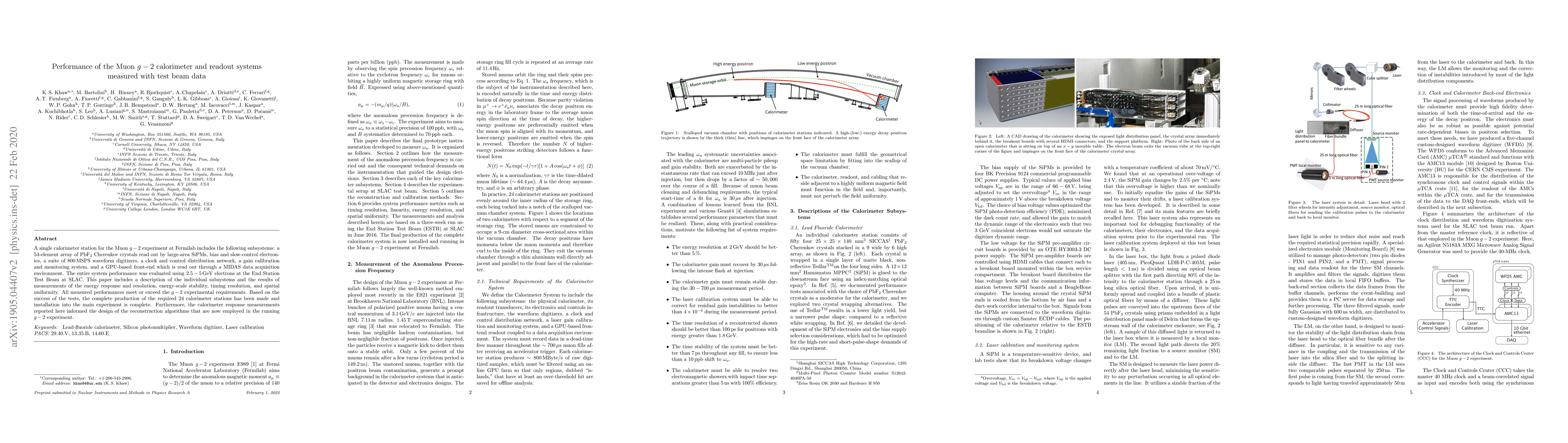 This paper evaluates the performance of the Muon $g-2$ experiment's calorimeter station using test beam data, demonstrating that all subsystems meet or exceed experimental requirements, leading to successful production and installation of the required 24 stations. The results also informed the design of reconstruction algorithms used in the ongoing $g-2$ experiment.