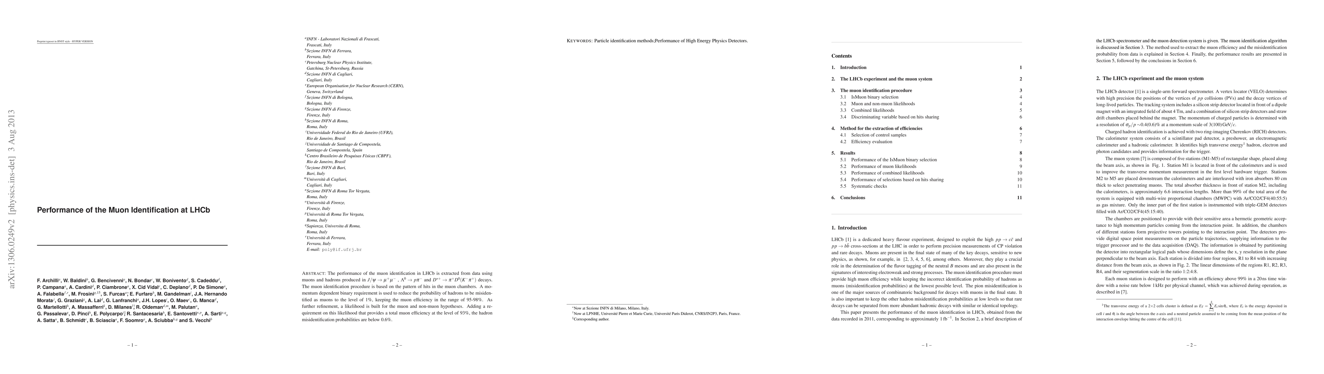 This paper evaluates the performance of muon identification in LHCb, utilizing decay patterns to distinguish muons from hadrons. The method employs a momentum-dependent binary requirement and a likelihood analysis, achieving a muon efficiency of 95-98% while reducing hadron misidentification to below 0.6%.