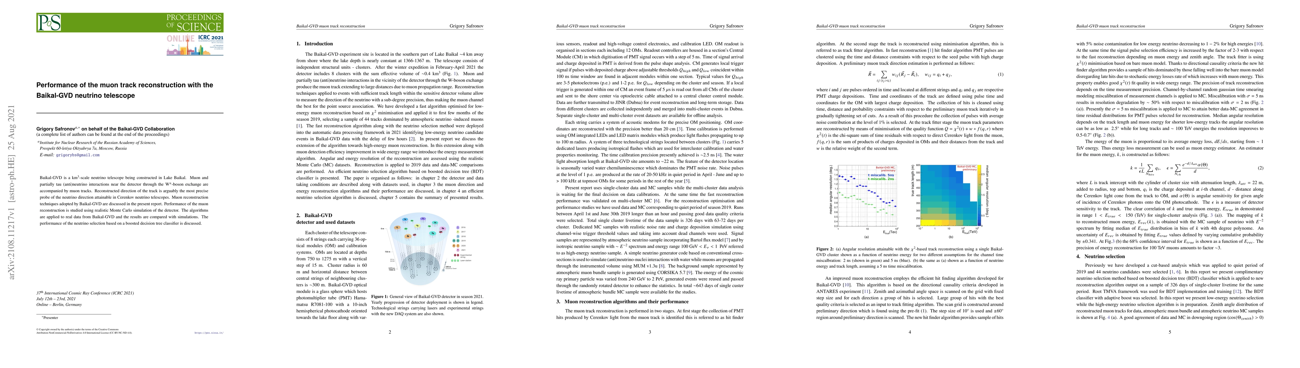 This paper discusses the muon track reconstruction techniques used in the Baikal-GVD neutrino telescope and evaluates their performance using Monte Carlo simulations and real data. The study compares the results from simulations to real data and assesses the effectiveness of a boosted decision tree classifier in neutrino selection.