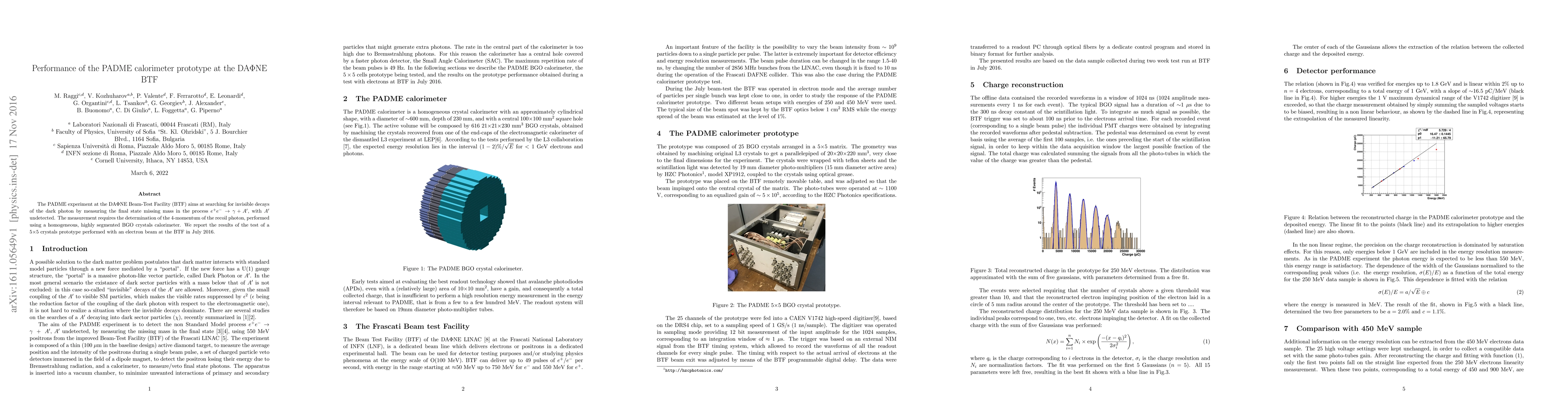 The PADME experiment tests a prototype calorimeter made of BGO crystals to detect recoil photons for searching invisible decays of dark photons. Initial results from a 5×5 crystals prototype tested in July 2016 at the DAΦNE BTF show promising performance.