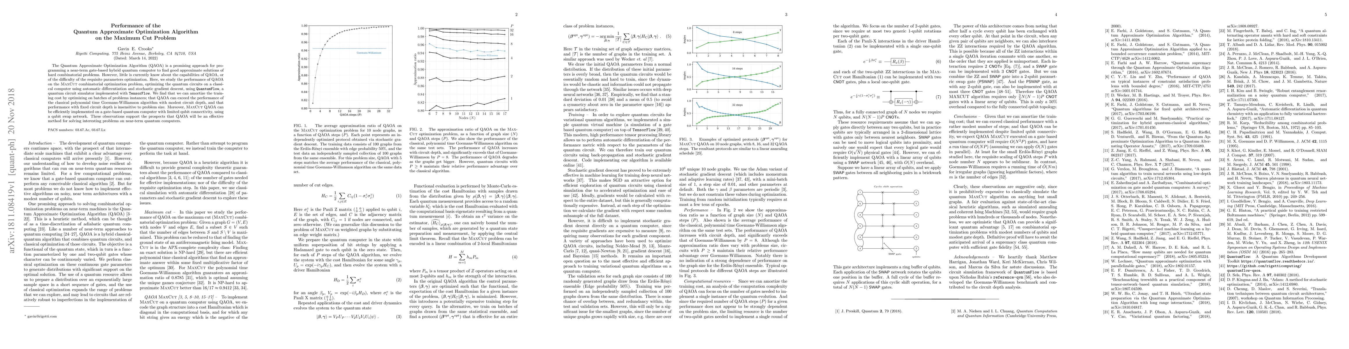 The Quantum Approximate Optimization Algorithm (QAOA) is a promising approach for programming a near-term gate-based hybrid quantum computer to find good approximate solutions of hard combinatorial problems. However, little is currently know about the capabilities of QAOA, or of the difficulty of the requisite parameters optimization. Here, we study the performance of QAOA on the MaxCut combinatorial optimization problem, optimizing the quantum circuits on a classical computer using automatic differentiation and stochastic gradient descent, using QuantumFlow, a quantum circuit simulator implemented with TensorFlow. We find that we can amortize the training cost by optimizing on batches of problems instances; that QAOA can exceed the performance of the classical polynomial time Goemans-Williamson algorithm with modest circuit depth, and that performance with fixed circuit depth is insensitive to problem size. Moreover, MaxCut QAOA can be efficiently implemented on a gate-based quantum computer with limited qubit connectivity, using a qubit swap network. These observations support the prospects that QAOA will be an effective method for solving interesting problems on near-term quantum computers.