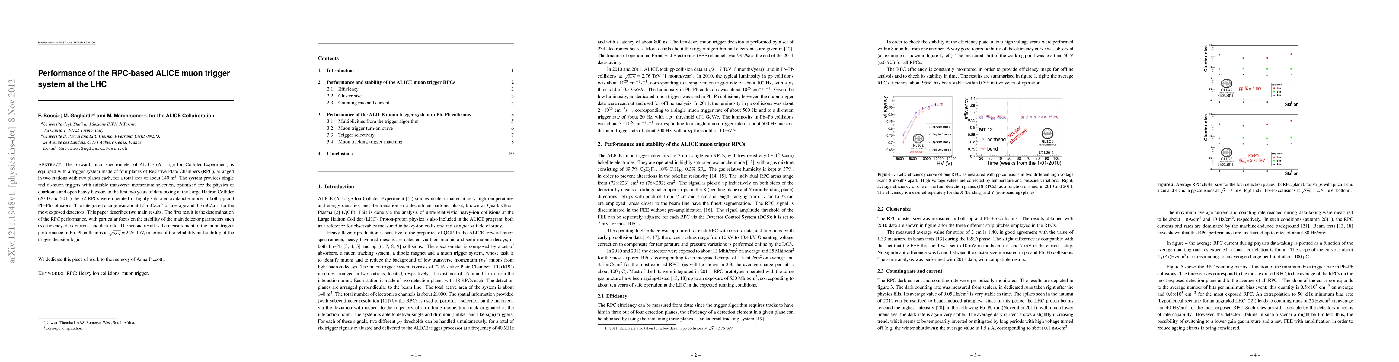 This paper evaluates the performance of ALICE's muon trigger system based on Resistive Plate Chambers (RPC) during the first two years of LHC operations, focusing on detector efficiency, dark current, and trigger reliability in Pb-Pb collisions. The study confirms stable RPC performance and effective muon trigger logic.