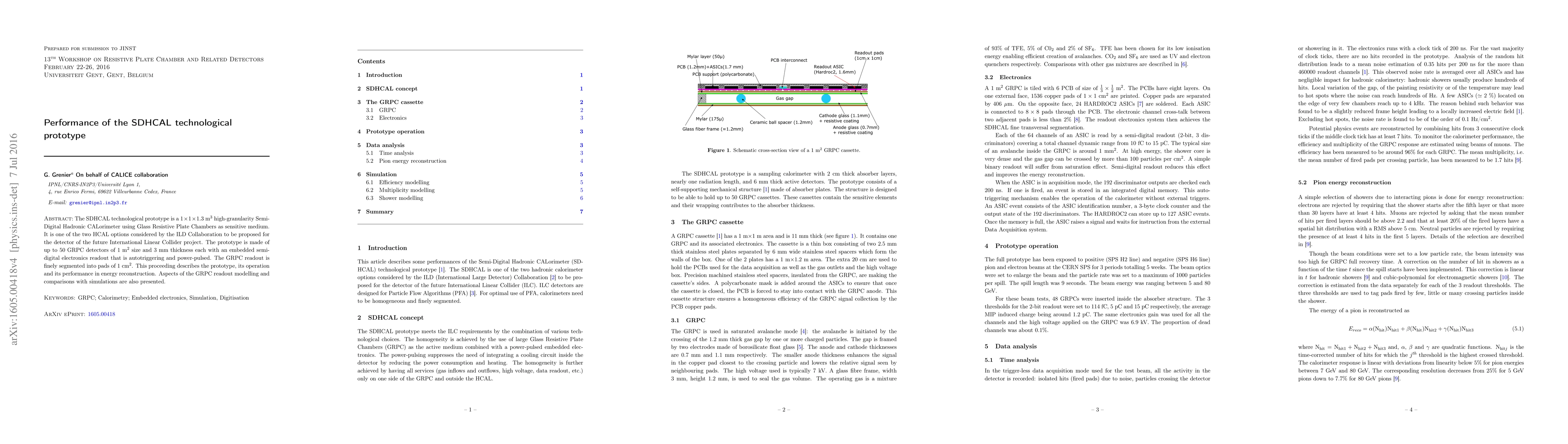 The SDHCAL prototype, a high-granularity calorimeter using Glass Resistive Plate Chambers, demonstrates effective energy reconstruction and autotriggering readout in a $1 \times 1 \times 1.3$~m$^3$ setup, evaluated for the future International Linear Collider project. Simulation comparisons and GRPC readout modeling further validate its performance.