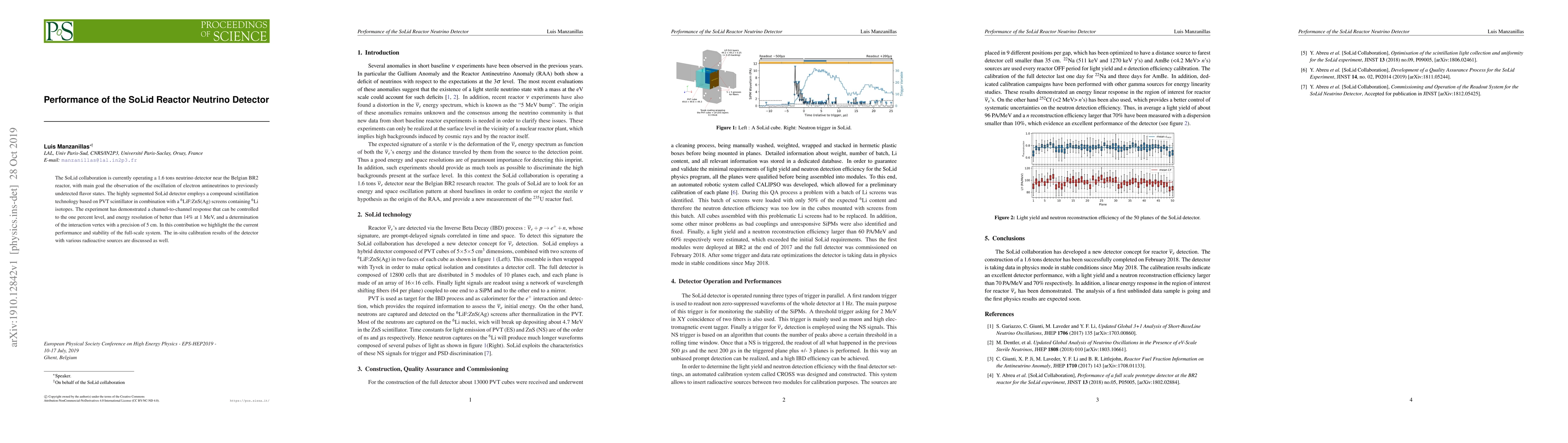 The SoLid collaboration is currently operating a 1.6 tons neutrino detector near the Belgian BR2 reactor, with main goal the observation of the oscillation of electron antineutrinos to previously undetected flavor states. The highly segmented SoLid detector employs a compound scintillation technology based on PVT scintillator in combination with a $^{6}$LiF:ZnS(Ag) screens containing $^{6}$Li isotopes. The experiment has demonstrated a channel-to-channel response that can be controlled to the one percent level, and energy resolution of better than 14\% at 1 MeV, and a determination of the interaction vertex with a precision of 5 cm. In this contribution we highlight the the current performance and stability of the full-scale system. The in-situ calibration results of the detector with various radioactive sources are discussed as well.