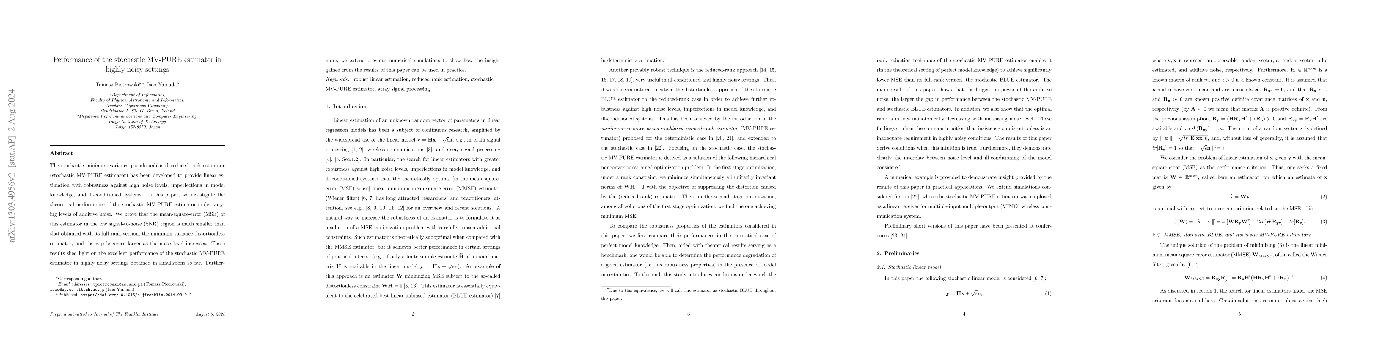 The stochastic MV-PURE estimator has been developed to provide linear estimation robust to ill-conditioning, high noise levels, and imperfections in model knowledge. In this paper, we investigate the theoretical performance of the stochastic MV-PURE estimator under varying level of additive noise. More precisely, we prove that the mean-square-error (MSE) of this estimator in the low signal-to-noise (SNR) region is much smaller than that obtained with its full-rank version, the minimum-variance distortionless estimator, and that the gap in performance is the larger the higher the noise level. These results shed light on the excellent performance of the stochastic MV-PURE estimator in highly noisy settings obtained in simulations so far. We extend here previously conducted numerical simulations to demonstrate a new insight provided by results of this paper in practical applications.