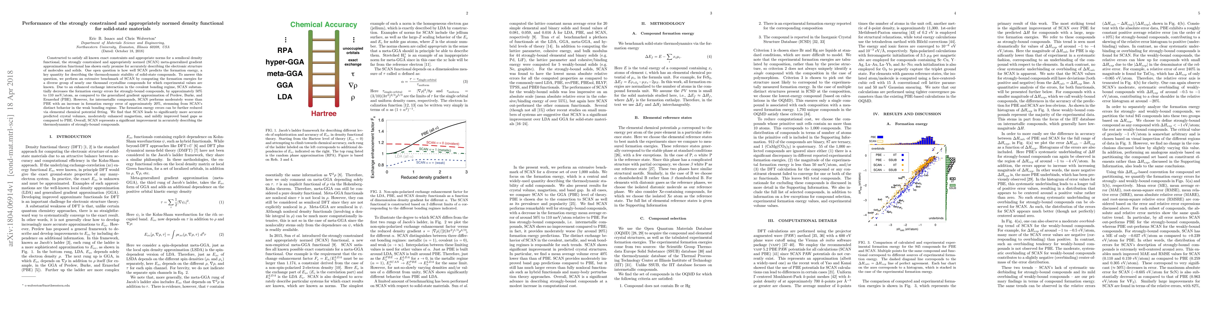 The SCAN meta-GGA functional shows substantial reductions in formation energy errors for strongly-bound compounds by approximately 50% to 110 meV/atom compared to PBE, but performs moderately worse for intermetallic compounds. SCAN also improves crystal volumes, magnetism, and band gaps.