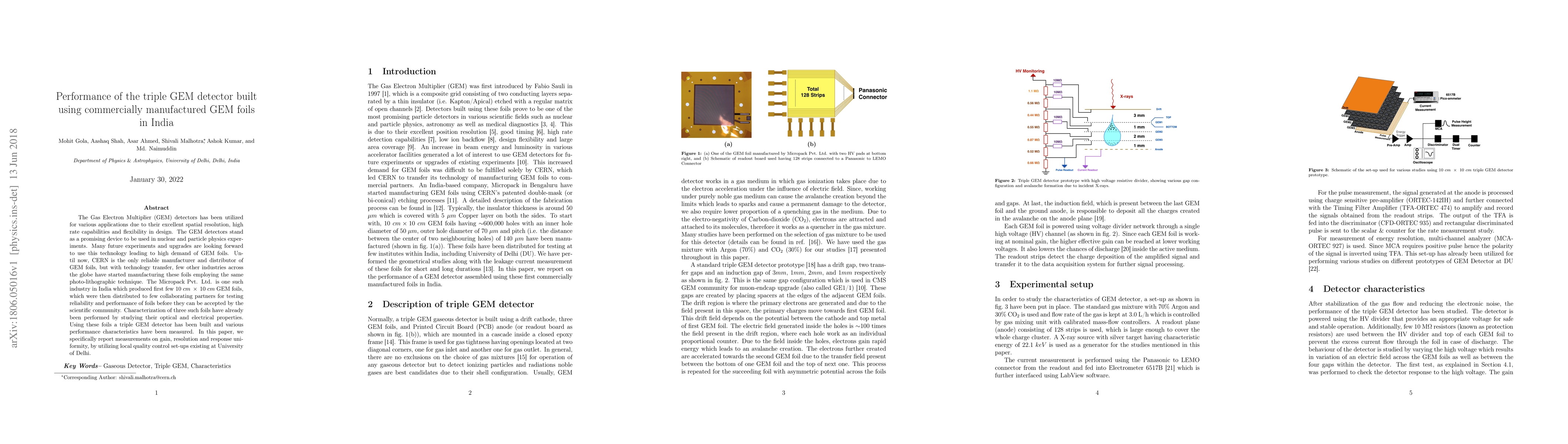 This paper evaluates the performance of a triple GEM detector constructed with commercially manufactured GEM foils from India, focusing on gain, resolution, and response uniformity using local quality control setups at the University of Delhi. The study aims to validate the reliability of locally produced GEM foils for use in nuclear and particle physics experiments.