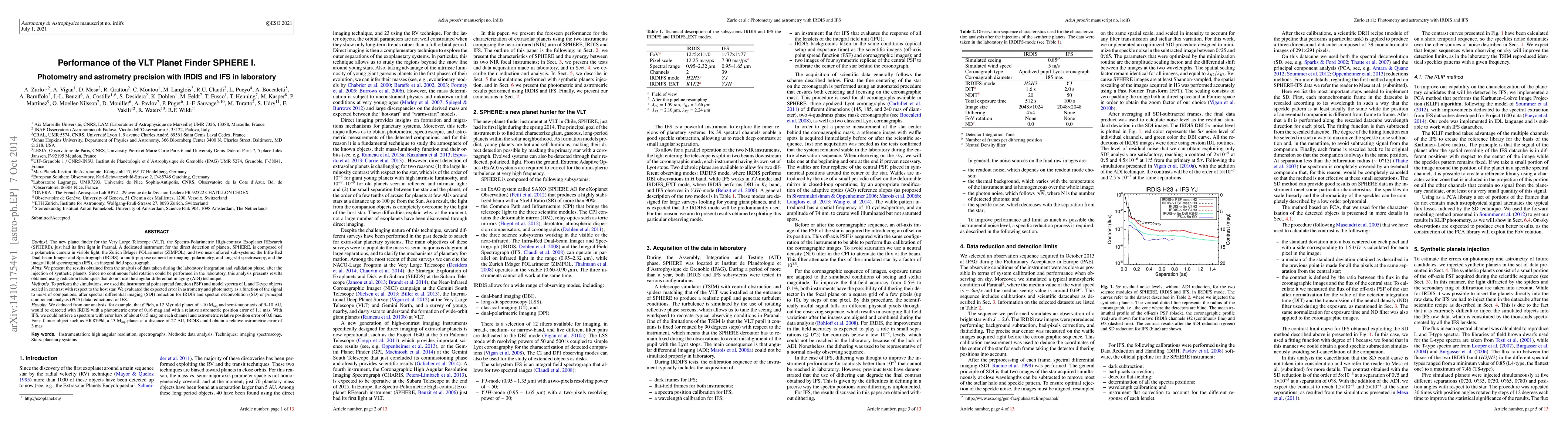 This paper evaluates the performance of the SPHERE instrument on the VLT, focusing on the IRDIS and IFS subsystems' photometric and astrometric precision during laboratory tests. The study simulates detection of synthetic planets and finds that IRDIS can detect $\beta$Picb with a photometric error of 0.16 mag and an astrometric error of 1.1 mas, while IFS achieves a spectral error of 0.15 mag per channel and an astrometric error of 0.6 mas.