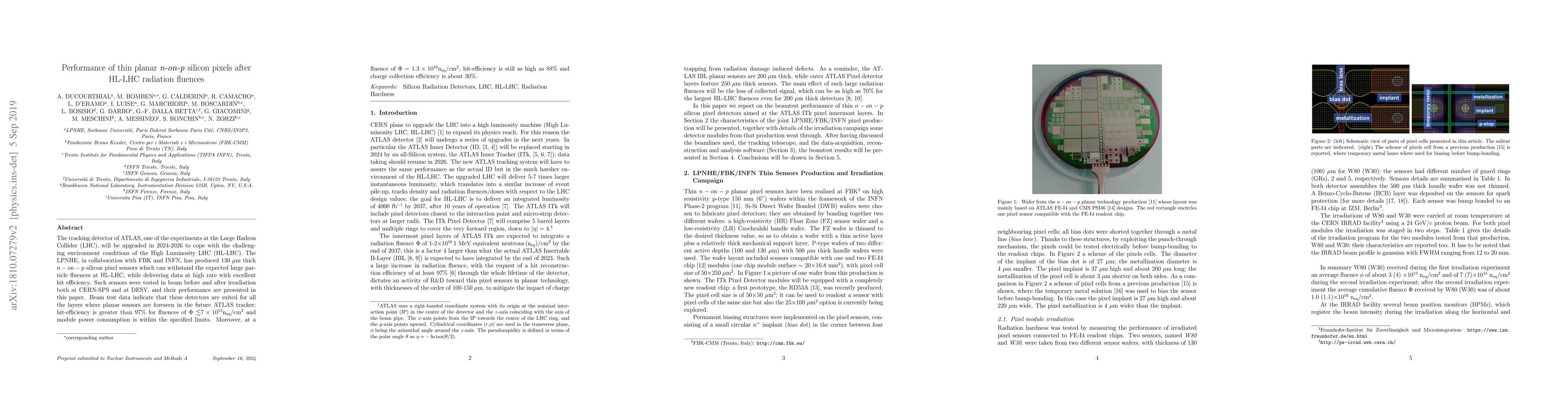 The tracking detector of ATLAS, one of the experiments at the Large Hadron Collider (LHC), will be upgraded in 2024-2026 to cope with the challenging environment conditions of the High Luminosity LHC (HL-LHC). The LPNHE, in collaboration with FBK and INFN, has produced 130~$\mu$m thick $n-on-p$ silicon pixel sensors which can withstand the expected large particle fluences at HL- LHC, while delivering data at high rate with excellent hit efficiency. Such sensors were tested on beam before and after irradiation both at CERN-SPS and at DESY, and their performances are presented in this paper. Beam test data indicate that these detectors are suited for all the layers where planar sensors are foreseen in the future ATLAS tracker: hit-efficiency is greater than 97\% for fluences $\Phi \lesssim 7\times10^{15}\rm{n_{eq}/cm^2}$ and module power consumption is within the specified limits. Moreover, at a fluence $\Phi = 1.3\times10^{16}\rm{n_{eq}/cm^2}$, hit-efficiency is still as high as 88\% and charge collection efficiency is about 30\%.