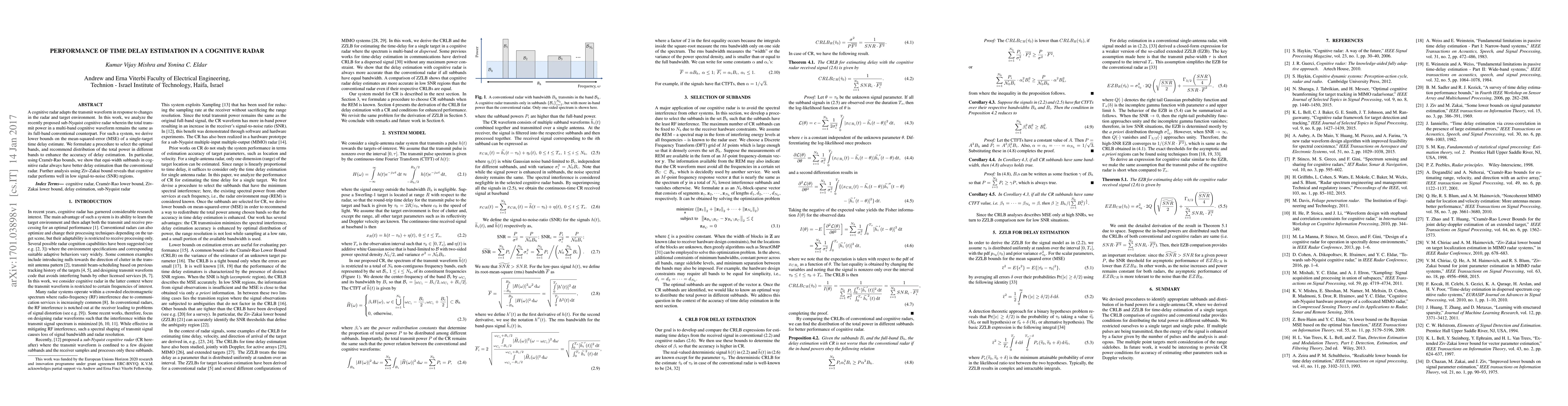 The paper presents derivations of Cramer-Rao bounds (CRLB) and Ziv-Zakai bounds (ZZLB) for time delay estimation in cognitive radars, providing conditions for optimal power distribution across subbands.