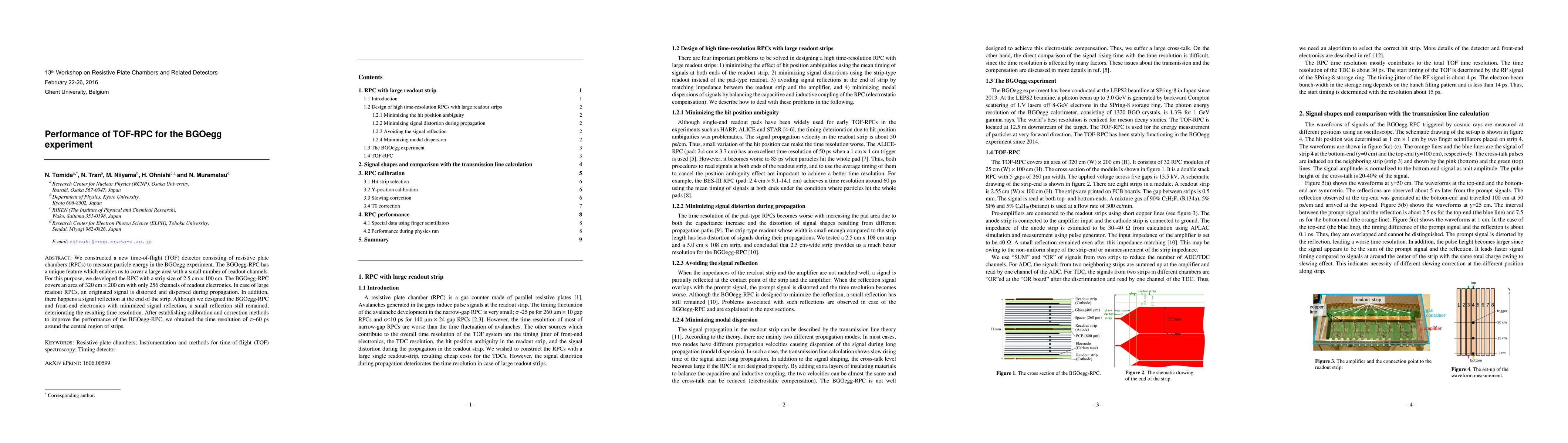 The BGOegg experiment utilized a new TOF-RPC detector with a large coverage area and minimal readout channels, achieving a time resolution of ~60 ps after calibration and correction for signal reflection issues. Despite initial signal distortion and reflection, the design improved overall performance.
