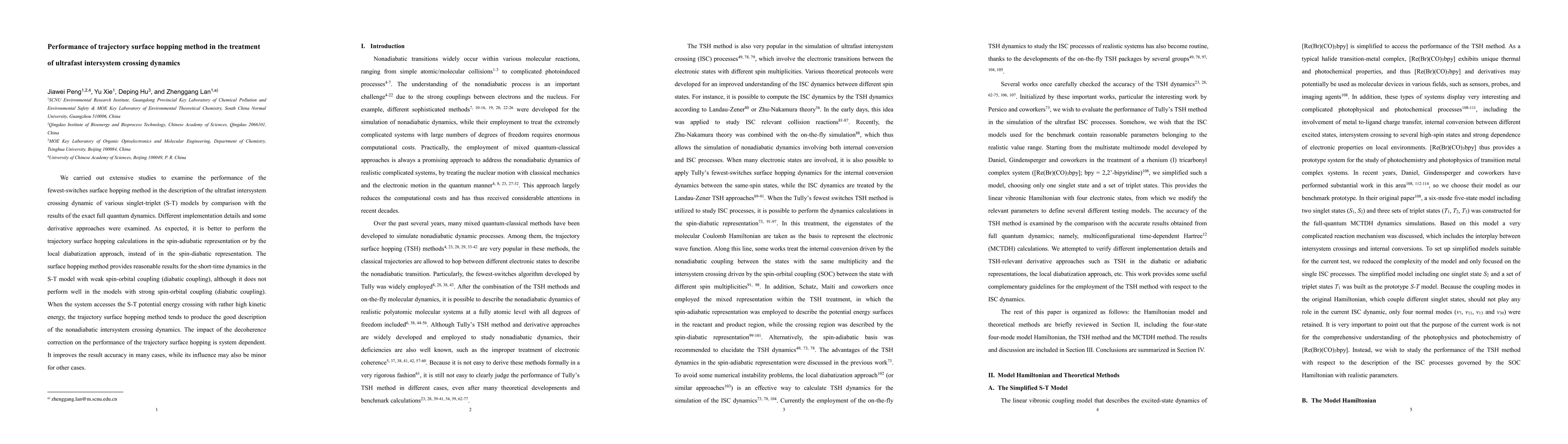 The trajectory surface hopping method effectively describes ultrafast intersystem crossing dynamics in S-T models with weak spin-orbital coupling, particularly when high kinetic energy is involved, but struggles with strong coupling. The spin-adiabatic representation and local diabatization enhance performance, while decoherence correction's impact varies by system.