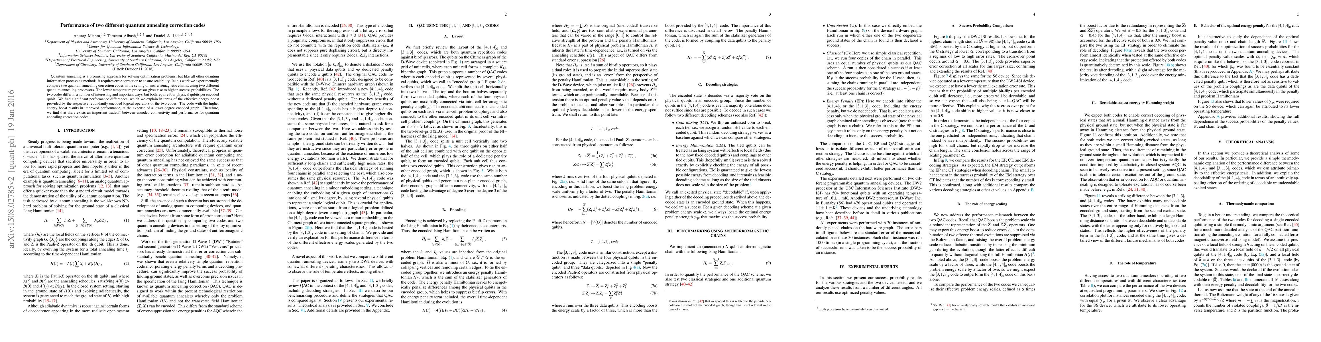 Quantum annealing is a promising approach for solving optimization problems, but like all other quantum information processing methods, it requires error correction to ensure scalability. In this work we experimentally compare two quantum annealing correction codes in the setting of antiferromagnetic chains, using two different quantum annealing processors. The lower temperature processor gives rise to higher success probabilities. The two codes differ in a number of interesting and important ways, but both require four physical qubits per encoded qubit. We find significant performance differences, which we explain in terms of the effective energy boost provided by the respective redundantly encoded logical operators of the two codes. The code with the higher energy boost results in improved performance, at the expense of a lower degree encoded graph. Therefore, we find that there exists an important tradeoff between encoded connectivity and performance for quantum annealing correction codes.