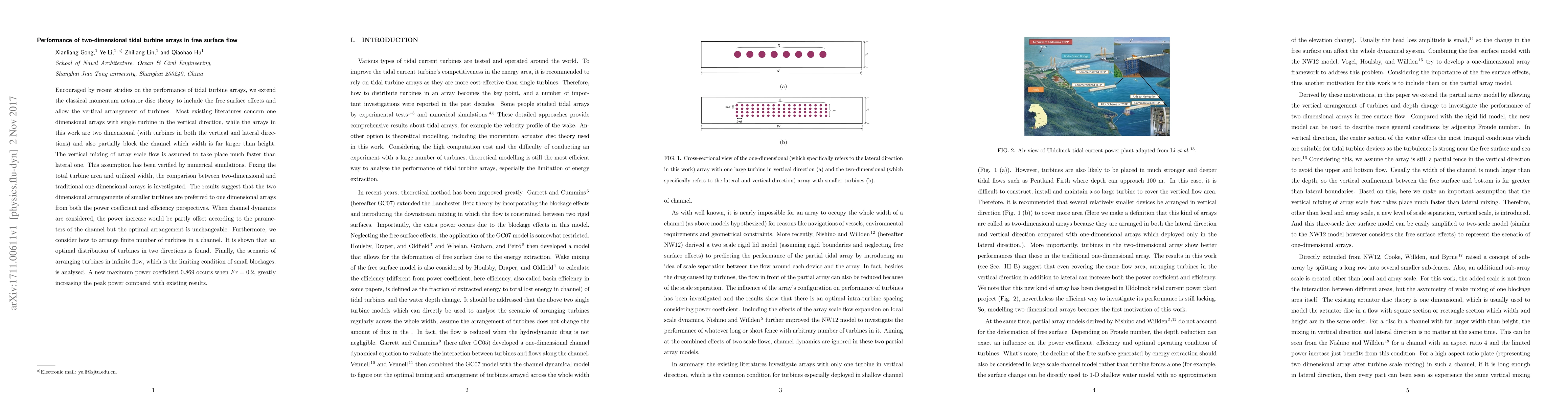 Encouraged by recent studies on the performance of tidal turbine arrays, we extend the classical momentum actuator disc theory to include the free surface effects and allow the vertical arrangement of turbines. Most existing literatures concern one dimensional arrays with single turbine in the vertical direction, while the arrays in this work are two dimensional (with turbines in both the vertical and lateral directions) and also partially block the channel which width is far larger than height. The vertical mixing of array scale flow is assumed to take place much faster than lateral one. This assumption has been verified by numerical simulations. Fixing the total turbine area and utilized width, the comparison between two-dimensional and traditional one-dimensional arrays is investigated. The results suggest that the two dimensional arrangements of smaller turbines are preferred to one dimensional arrays from both the power coefficient and efficiency perspectives. When channel dynamics are considered, the power increase would be partly offset according to the parameters of the channel but the optimal arrangement is unchangeable. Furthermore, we consider how to arrange finite number of turbines in a channel. It is shown that an optimal distribution of turbines in two directions is found. Finally, the scenario of arranging turbines in infinite flow, which is the limiting condition of small blockages, is analysed. A new maximum power coefficient 0.869 occurs when $Fr=0.2$, greatly increasing the peak power compared with existing results.