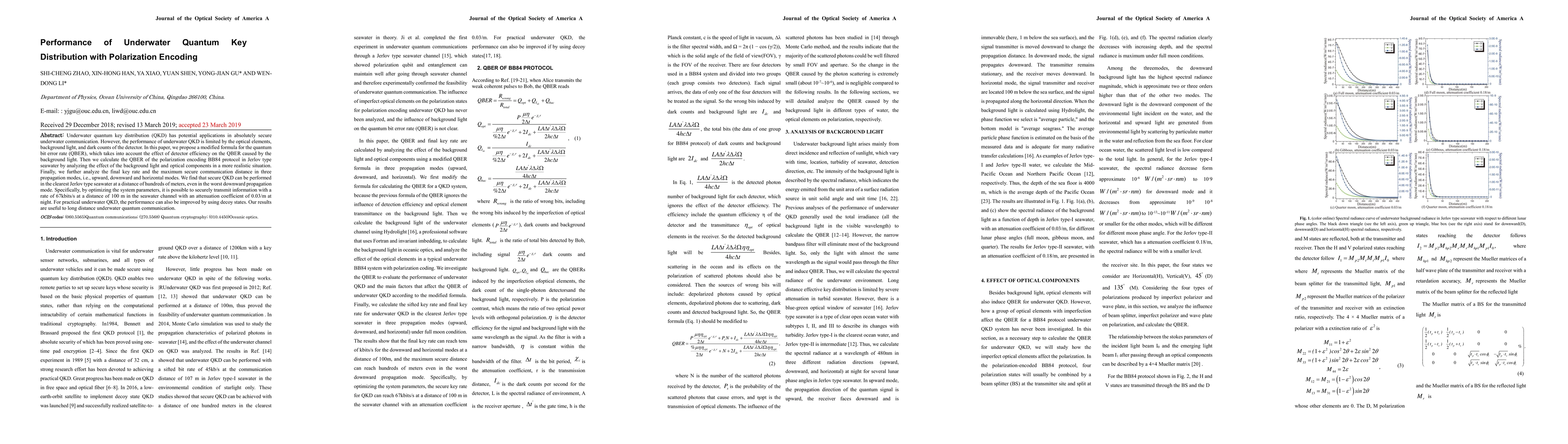 This paper proposes a modified formula for the quantum bit error rate (QBER) in underwater quantum key distribution (QKD) considering detector efficiency and background light, and calculates the QBER for polarization encoding BB84 protocol in Jerlov type seawater. It finds secure QKD feasible at hundreds of meters in the clearest seawater, achieving a key rate of 67 kbits/s at 100 m, and suggests that performance can be enhanced using decoy states.