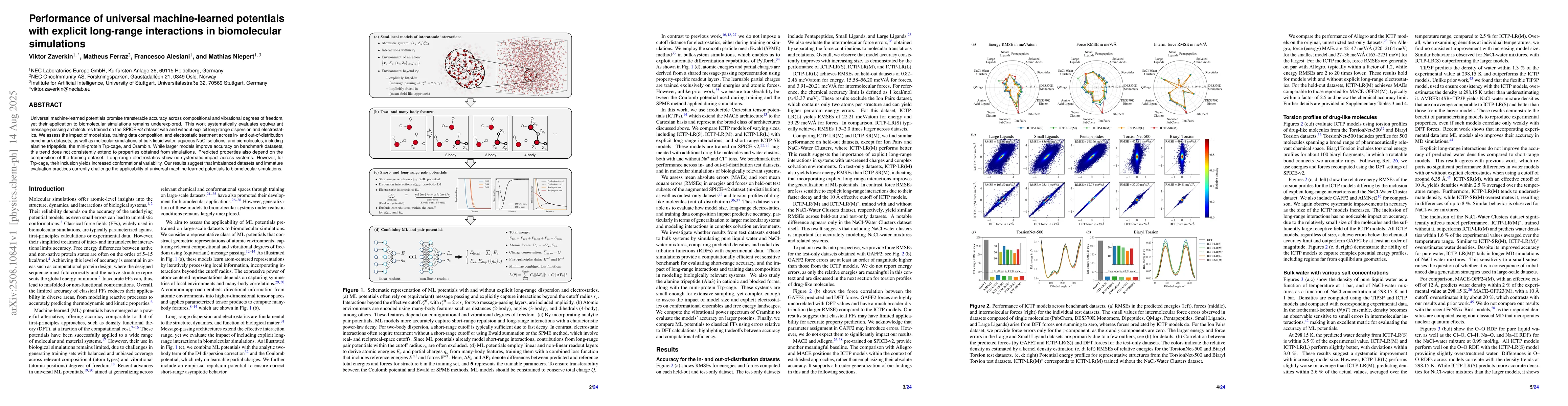 This study evaluates universal machine-learned potentials in biomolecular simulations, finding that larger models improve benchmark accuracy but not necessarily simulation properties. Results depend on training data composition, and long-range electrostatics impact varies across systems, with increased conformational variability observed for Trp-cage. The research highlights challenges due to imbalanced datasets and evaluation practices in applying these potentials to biomolecular simulations.