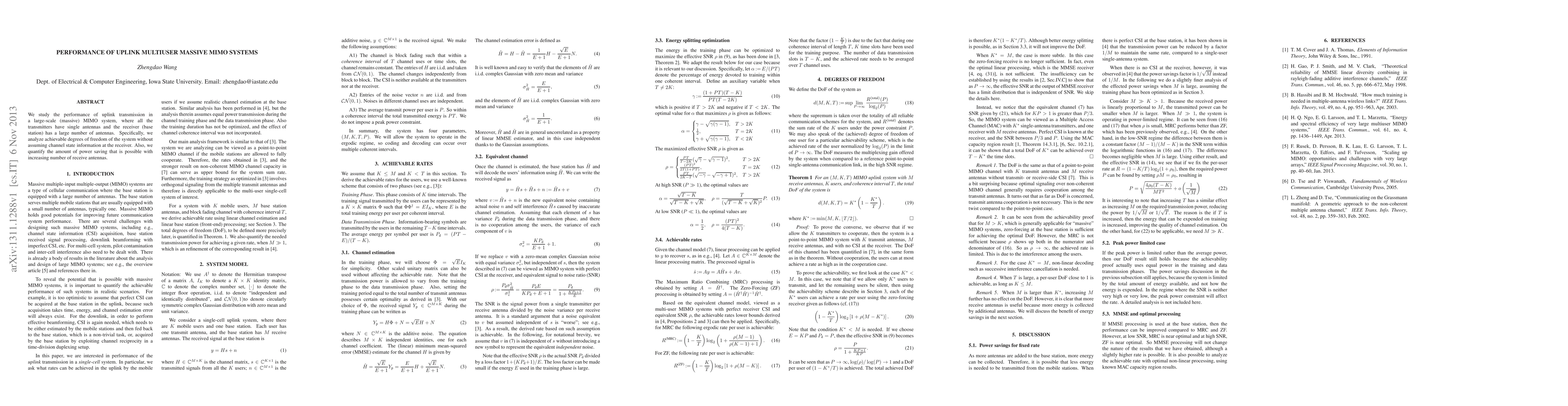 This paper investigates the performance of uplink multiuser massive MIMO systems, focusing on achievable degrees of freedom without receiver channel state information and quantifying power savings with an increasing number of receive antennas.