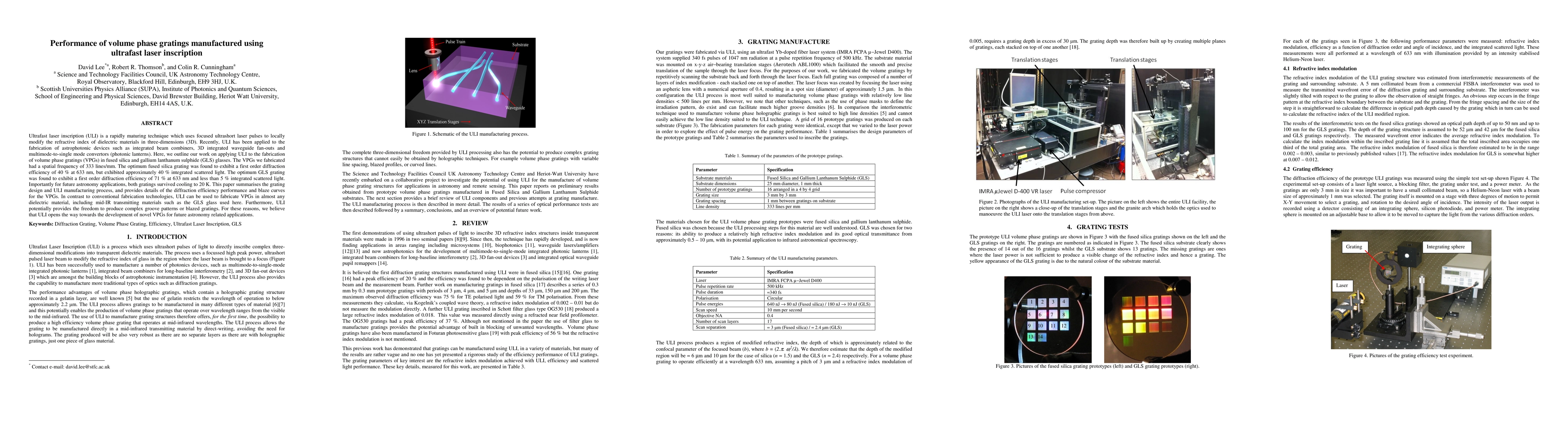 This paper investigates the use of ultrafast laser inscription (ULI) to fabricate volume phase gratings (VPGs) in fused silica and gallium lanthanum sulphide (GLS) glasses, achieving high diffraction efficiencies of 40% and 71% respectively at 633 nm with minimal scattering. ULI's versatility in producing complex grating patterns makes it a promising technique for future astronomy applications.
